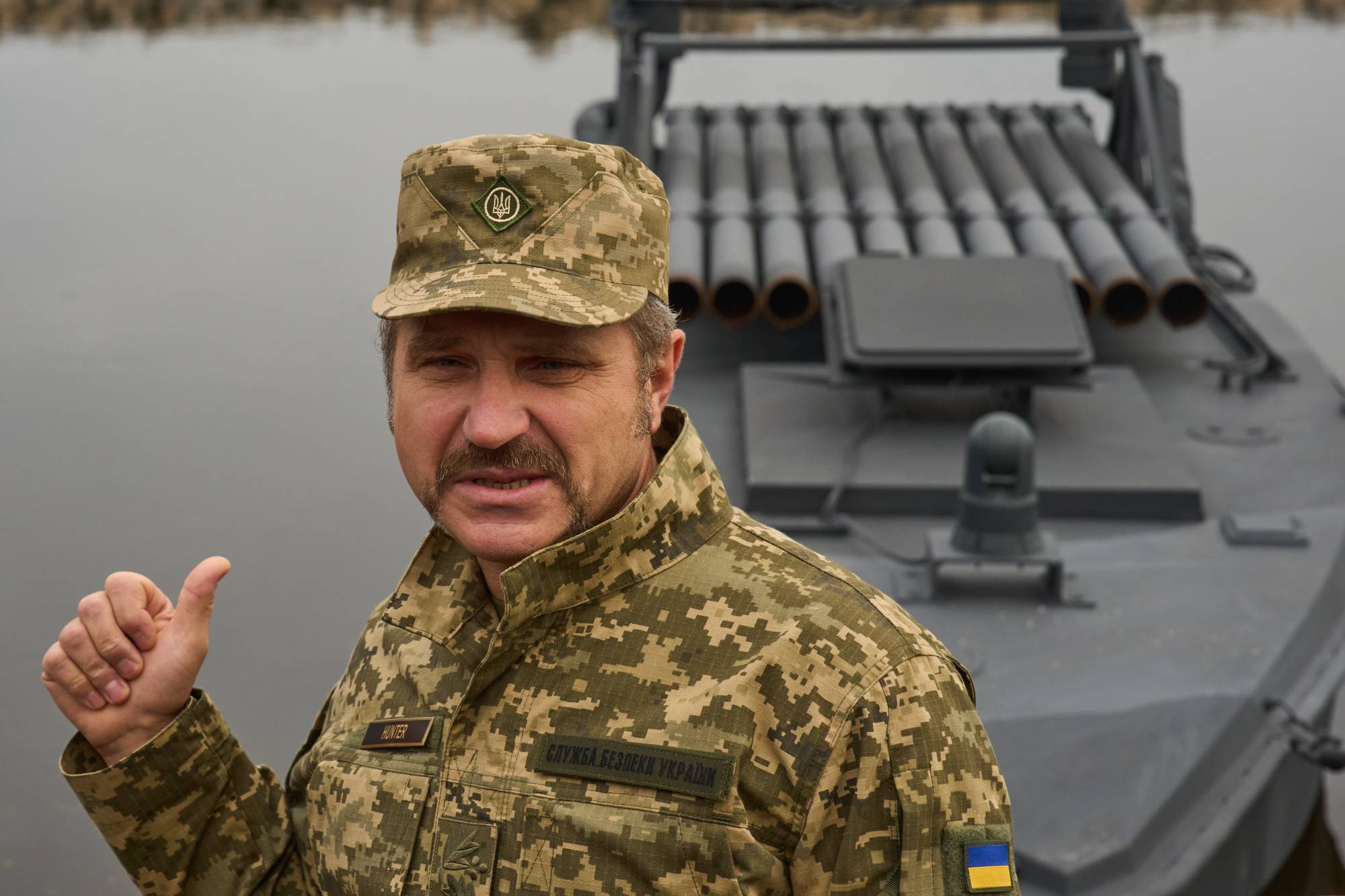 الجنرال إيفان لوكاشيفيتش من لواء جهاز الأمن الأوكراني يجيب على أسئلة وسائل الإعلام أمام المسيّرة البحرية من طراز «سي بيبي» خلال عرض توضيحي في مكان غير معلن في أوكرانيا 17 أكتوبر 2025 (أ.ب)