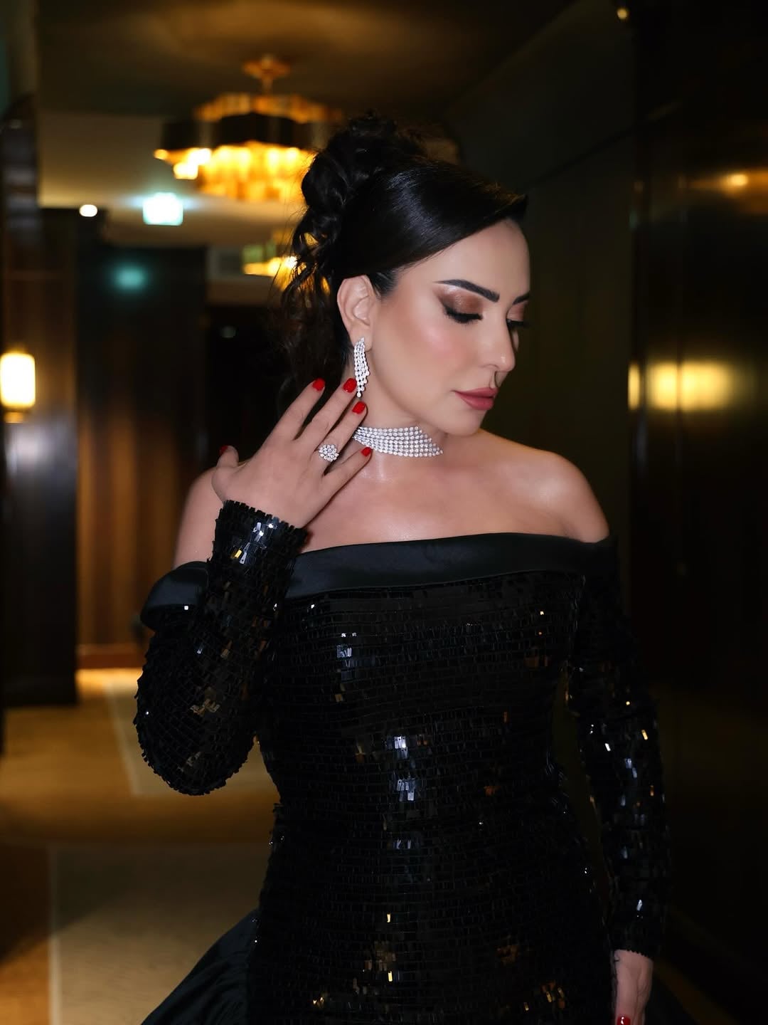 أما النجمة أمل عرفة فاختارت فستاناً مناعماً باللون الأسود بتصميم يمزج بين الكلاسيكية والتفاصيل الأنيقة، وجاء مكشوف عند الكتفين، بأكمام طويلة وبصيحة الترتر البراقة التي غطت كامل الفستان، وأضيف إليه من الخلف ذيل ضخم منح اطلالتها المزيد من اللمسات الدرامية الملفتة.