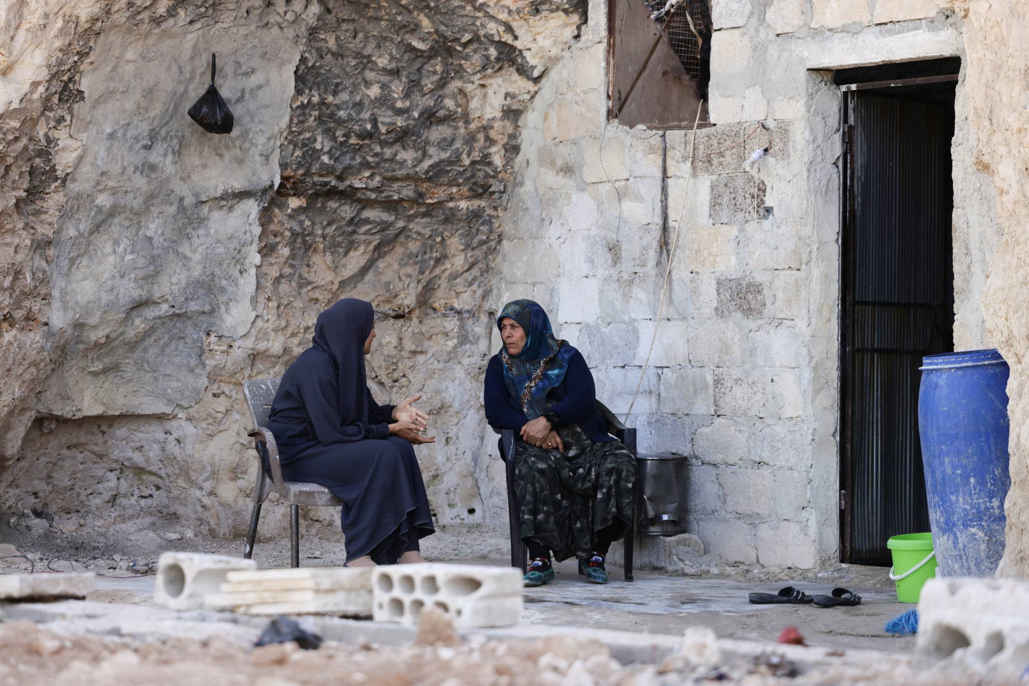 رجاء عزو التي تعيش في كهف مع عائلتها تتحدث إلى امرأة أخرى أمام مدخل الكهف في بلدة اللطامنة بريف حماة وسط سوريا (رويترز)