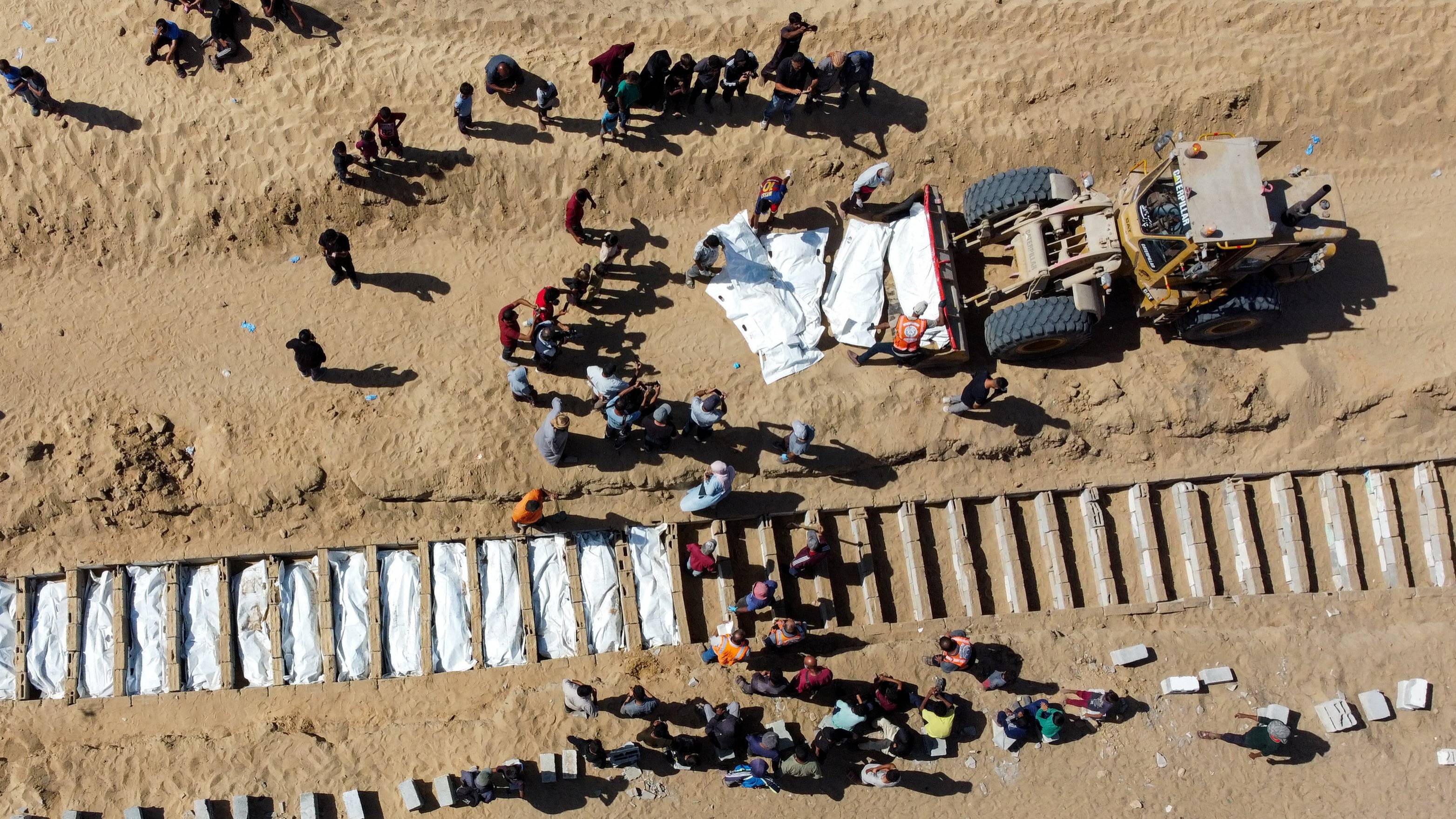 فلسطينيون يدفنون جثثاً مجهولة الهوية لمحتجزين بإسرائيل خلال الحرب في دير البلح (رويترز)