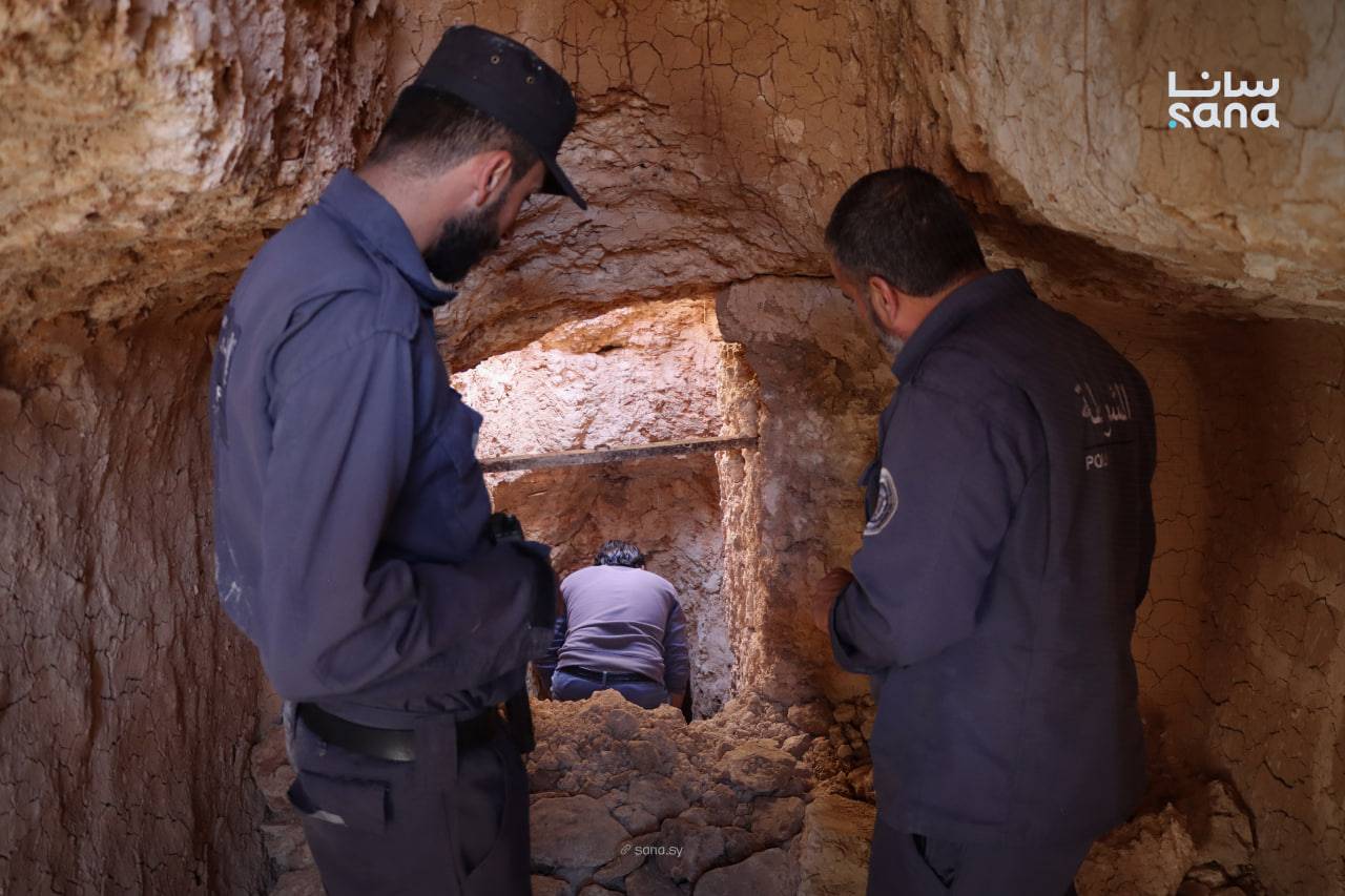 رجال الشرطة أثناء تفحصهم النفق المؤدي إلى السجن تحت الأرض في ريف حمص الشرقي (سانا)