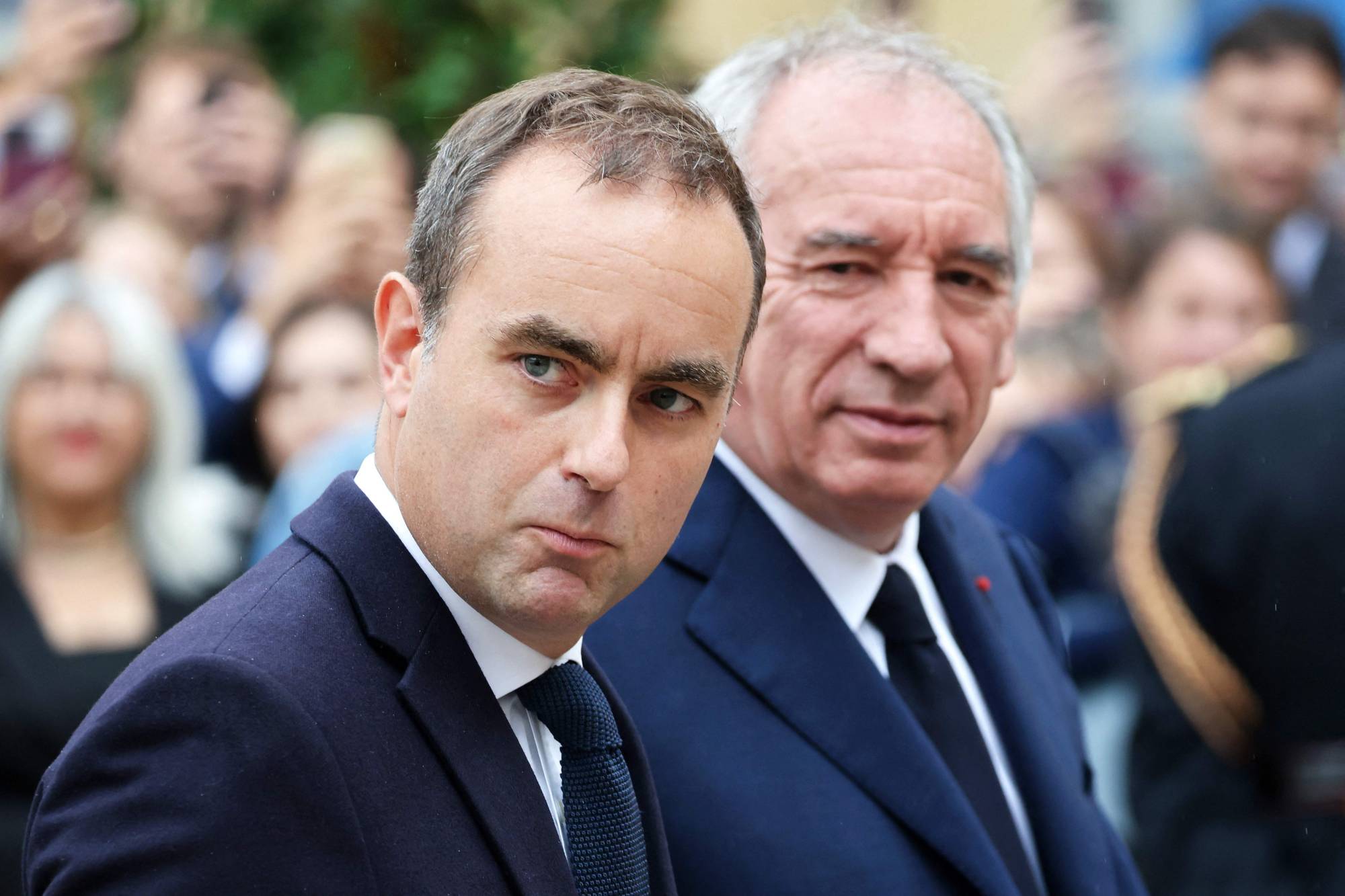 رئيس الحكومة الفرنسية المستقيل سيباستيان لوكورنو إلى جانب فرنسوا بايرو الذي استقال من رئاسة الحكومة الشهر الماضي خلال حفل استقبال في «الإليزيه» يوم 10 سبتمبر الماضي (أ.ف.ب)