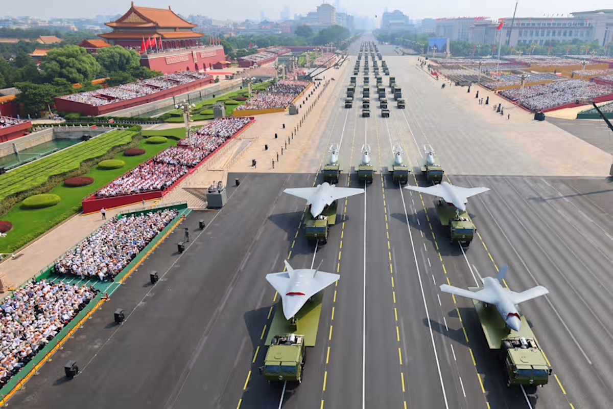 مرت الأسلحة التي تفوق سرعتها سرعة الصوت، والطائرات بدون طيار ذات القدرات المختلفة، وأنظمة الدفاع الجوي التي تعمل بالليزر، والصواريخ الباليستية الجوية والسطحية والغواصات، عبر منصة المراجعة حيث كان شي محاطًا ببوتين من روسيا وكيم من كوريا الشمالية.