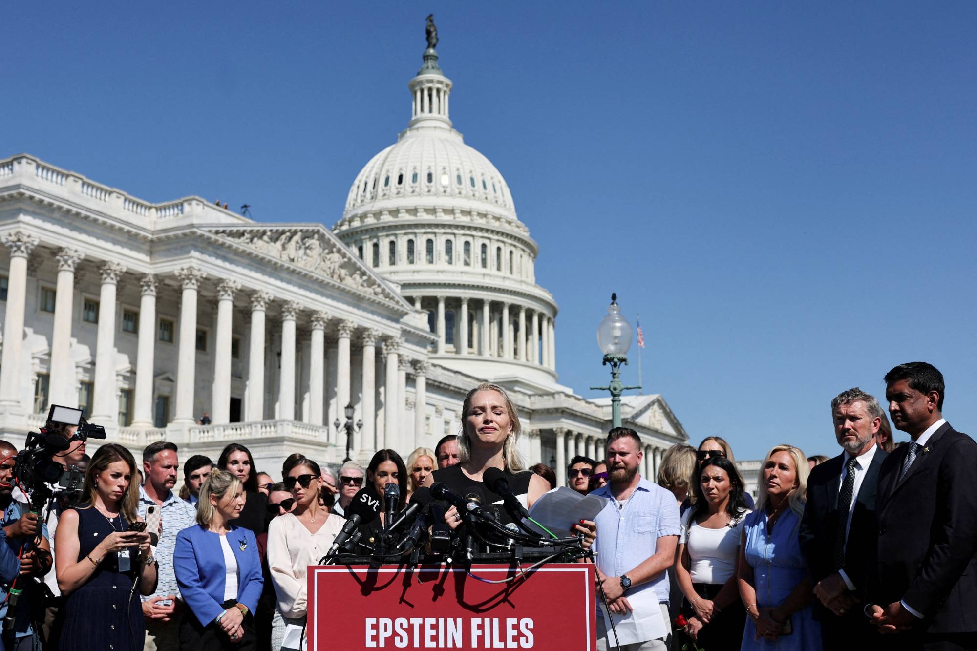 مؤتمر صحافي أمام الكونغرس للدعوة للإفراج عن وثائق إبستين في 3 سبتمبر 2025 (رويترز)