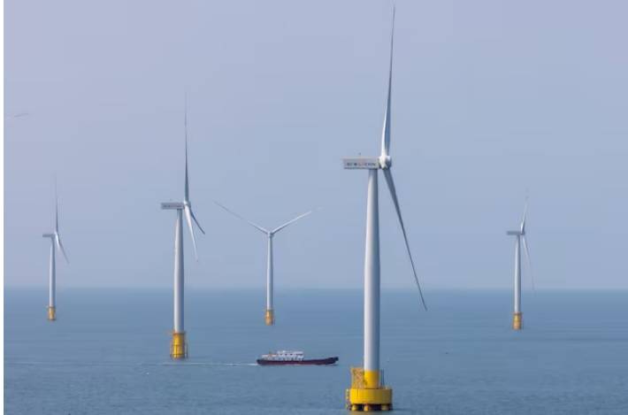 سفينة تبحر بين توربينات الرياح في مضيق تايوان قبالة ساحل جزيرة بينغتان مقاطعة فوجيان الصين (أرشيفية – رويترز)