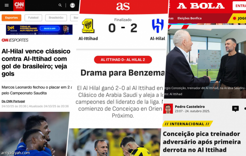 أما صحيفة «ABOLA» البرتغالية، فقد سلَّطت الضوء على مؤتمر البرتغالي سيرجيو كونسيساو، مدرب الاتحاد، بعنوان «بعد هزيمته الأولى، يلدغ كونسيساو خصمه»، رابطة بين تصريحاته وذكريات مصافحته السابقة مع الإيطالي سيموني إنزاجي، مدرب الهلال، في مواجهات سابقة.