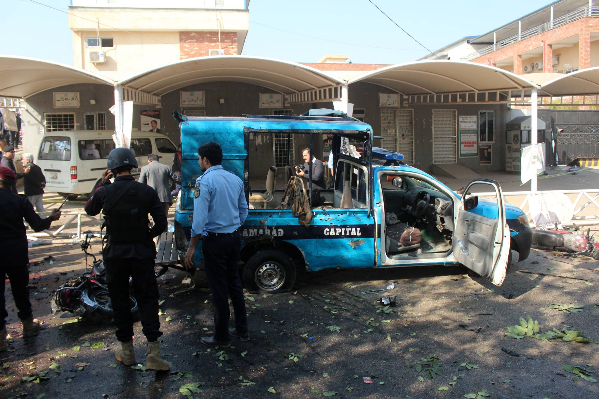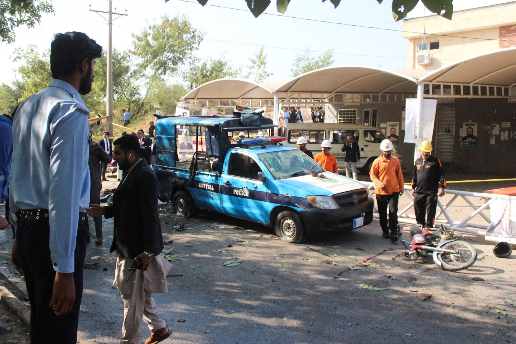 باكستانيون قرب سيارة للشرطة تضررت بالتفجير خارج مجمع المحاكم في إسلام آباد (رويترز)