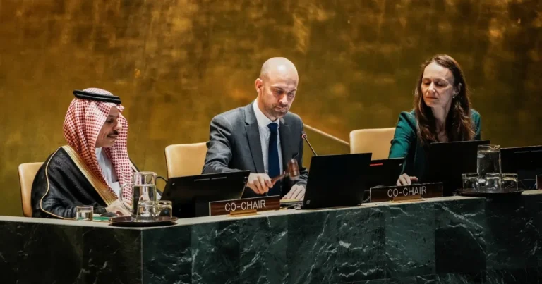 وصادقت الجمعية العامة للأمم المتحدة هذا الشهر على إعلان من سبع صفحات يحدد “خطوات ملموسة ومحددة المدة ولا رجعة فيها” نحو حل الدولتين، مع التنديد بحركة “حماس”، ومطالبتها بالاستسلام وإلقاء سلاحها.