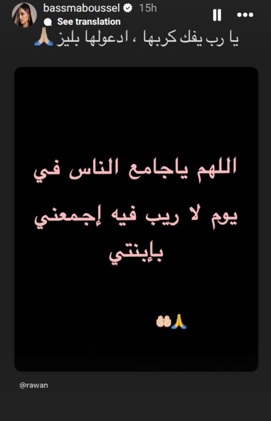 ونشرت طليقة الفنان المصري تامر حسني دعاء كانت شاركته بن حسين تطلب فيه الاجتماع بابنتها الوحيدة لونا المقريف، وأضافت بوسيل معلقةً: “يا رب يفك كربها، ادعوا لها رجاءً”.