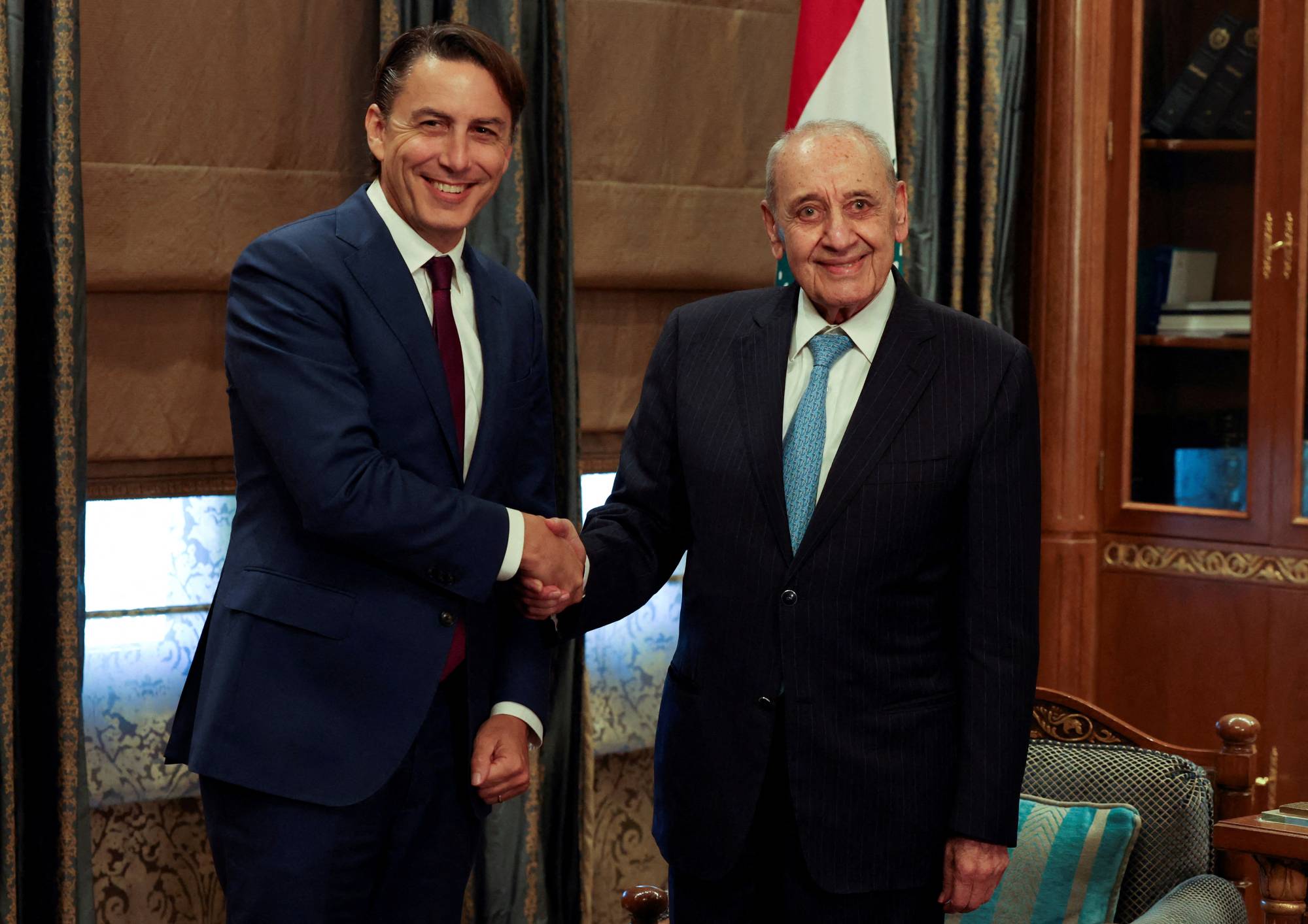 رئيس البرلمان اللبناني نبيه بري (يمين) يصافح المبعوث الأميركي آموس هوكستين في بيروت خلال مفاوضات ترسيم الحدود البحرية في 2022 (أرشيفية – رويترز)