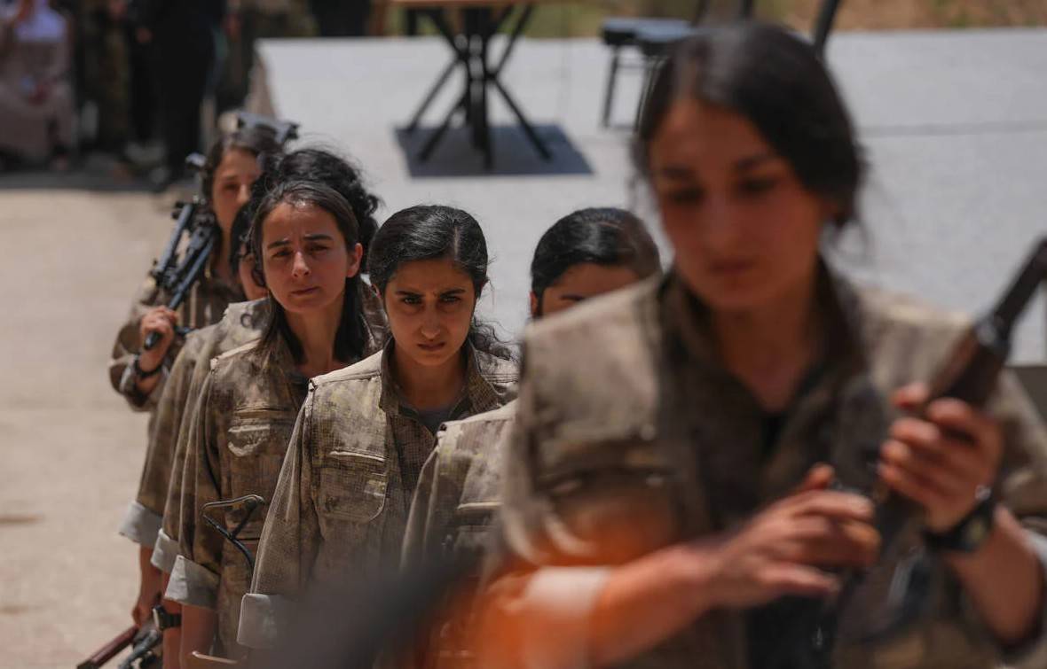 مجموعة من عناصر «العمال الكردستاني» أثناء مراسم لإحراق الأسلحة أقيمت في السليمانية في 11 يوليو استجابة لدعوة أوجلان (رويترز)