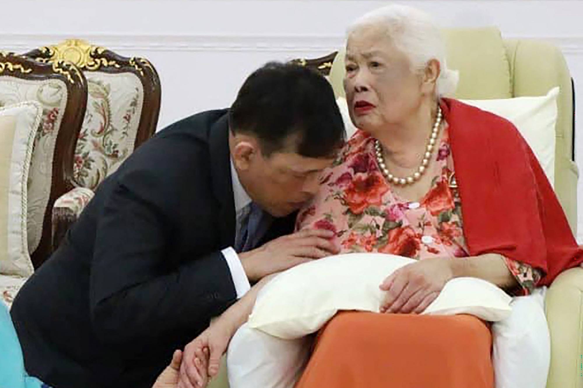 ملك تايلاند ماها فاجيرالونكورن رفقة والدته الملكة الأم سيريكيت في عيد ميلادها الـ88 (ا.ف.ب)
