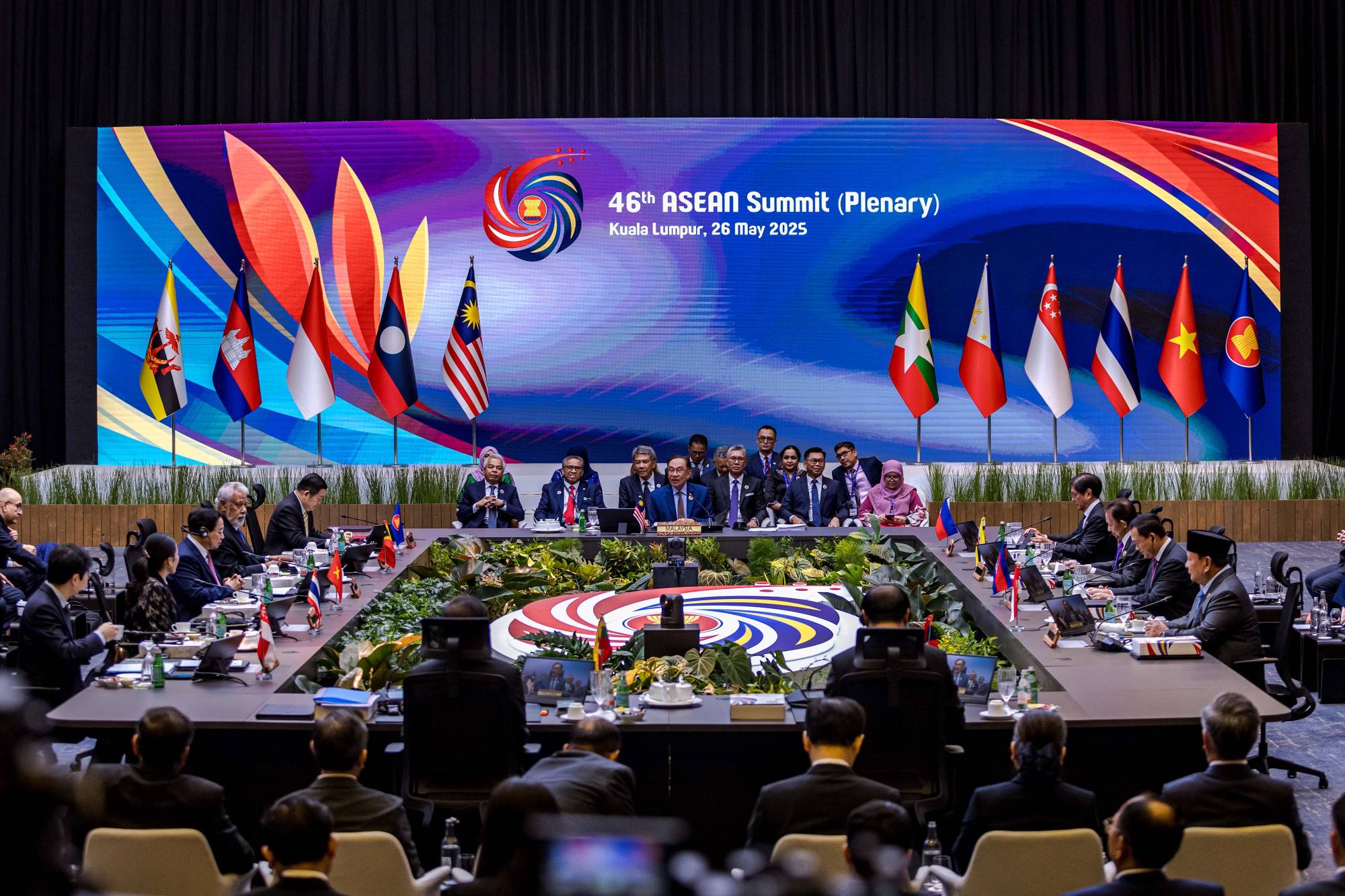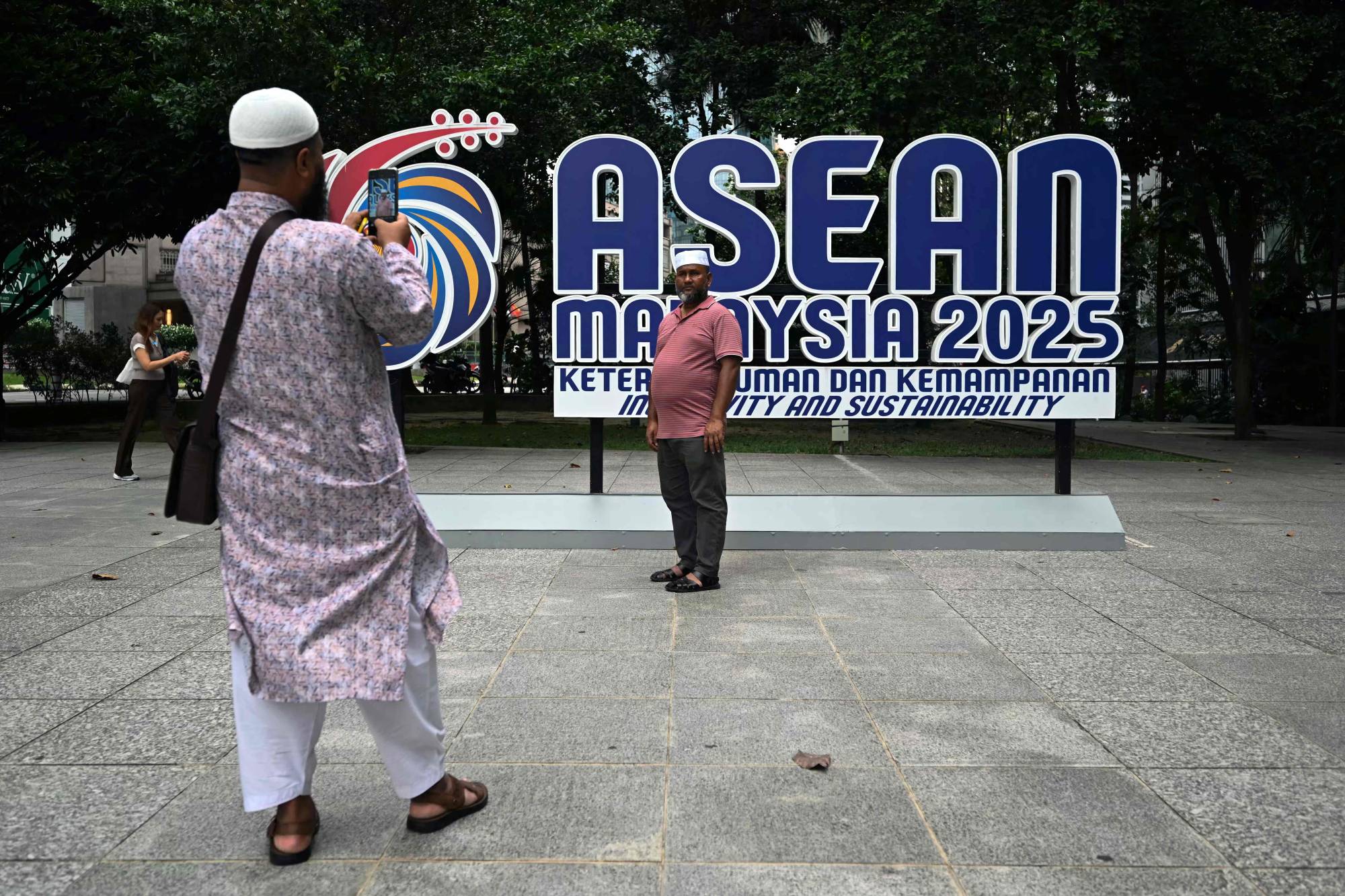 سياح يلتقطون صوراً تذكارية أمام شعار قمة «آسيان» في العاصمة الماليزية كوالالمبور 15 مايو 2025 (أ.ف.ب)