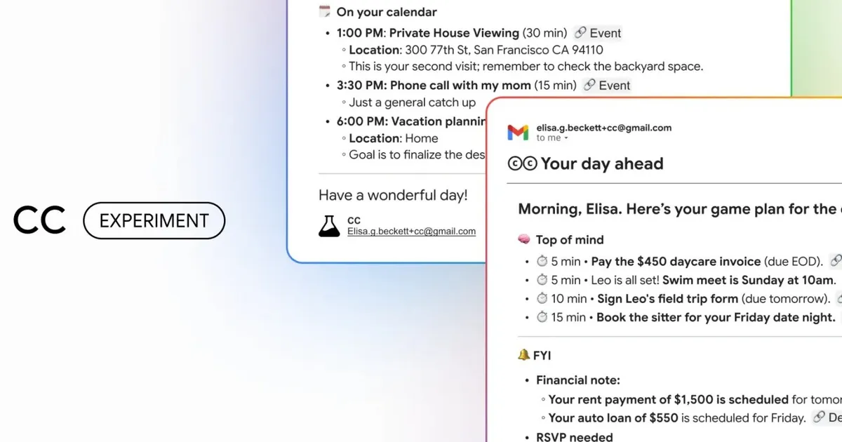 بدأت شركة جوجل اختبار خدمة جديدة تحمل اسم CC، تحلل ملفات المستخدم المحفوظة على جوجل درايف، ورسائله على البريد، والفعاليات والمهام المحفوظة بحسابه على تقويم Google Calendar، لتقديم ملخص يومي لأهم ما يحتاج المستخدم لفعله على مدار اليوم.
