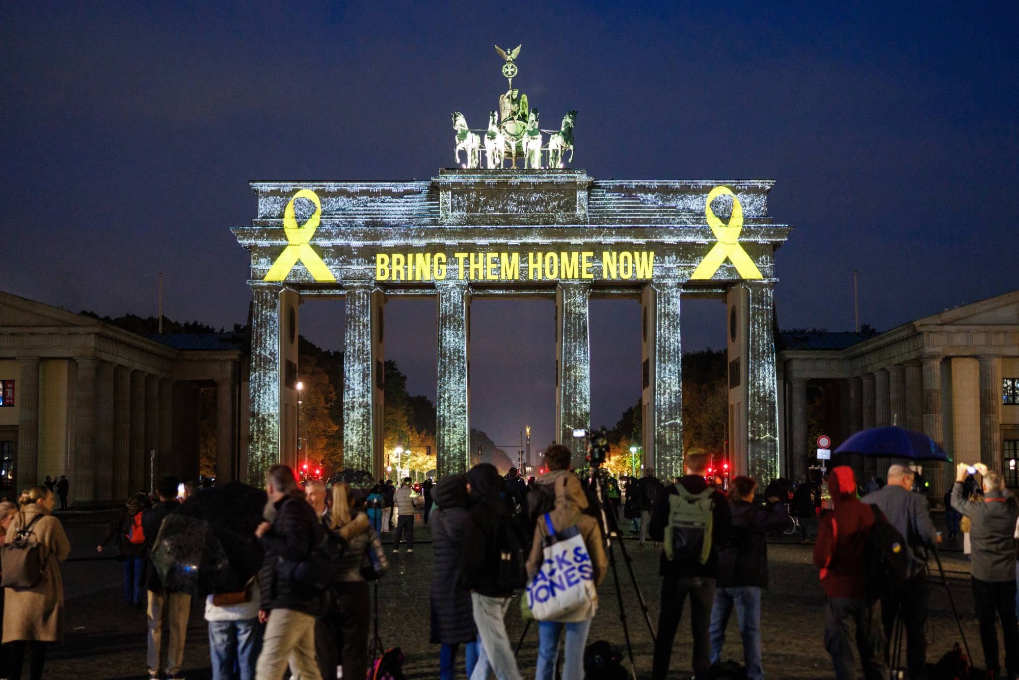وعند بوابة براندنبورغ بالعاصمة برلين، أقيمت في ساعات الصباح الأولى مراسم لتلاوة أسماء قتلى الهجوم، وبعد ذلك تم وضع 1100 كرسي شاغر يعبر عن قتلى الهجوم، وكتب بالأضواء على البوابة عبارة «أعيدوهم إلى الوطن الآن»، وذلك في دعوة للإفراج عن المحتجزين الإسرائيليين في قطاع غزة.