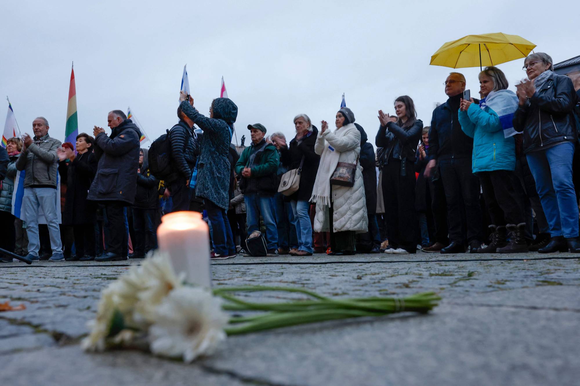 زهور وشموع تم وضعها أثناء حضور الناس وقفة احتجاجية للرهائن الإسرائيليين في ساحة بيبل بلاتس في برلين 7 أكتوبر 2025 (أ.ف.ب)