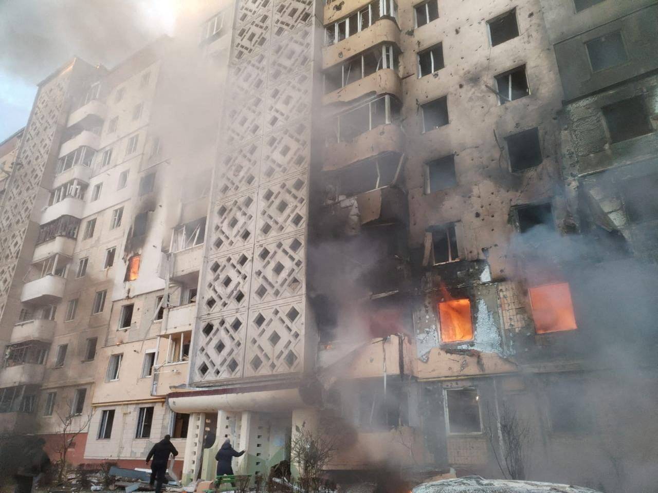 سيارات تحترق بالقرب من مبنى سكني تعرَّض لغارة روسية في خاركيف (رويترز)