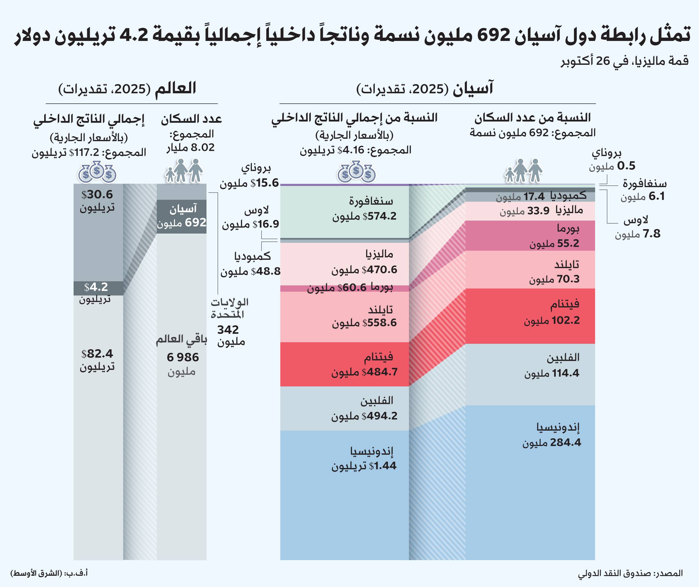 يُذكر أن «آسيان» تضم كلاً من: بروناي، وكمبوديا، وإندونيسيا، ولاوس، وماليزيا، وميانمار، والفلبين، وسنغافورة، وتايلاند، وتيمور الشرقية، وفيتنام.