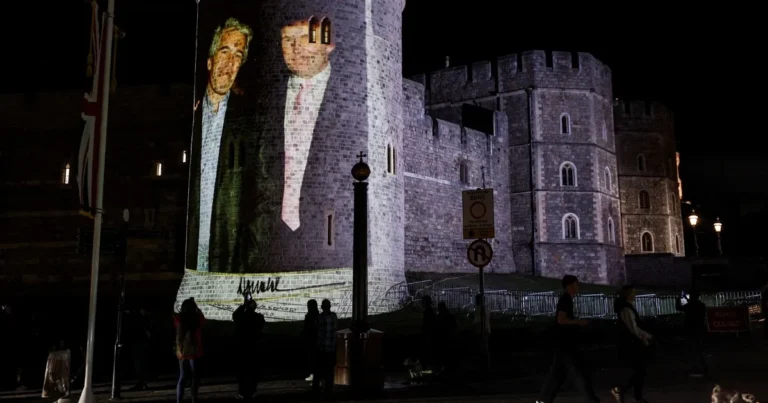 ووصل ترمب إلى بريطانيا، مساء الثلاثاء، في زيارة رسمية، قبل أن يكشف المحتجون عن لافتة ضخمة تحمل صورة لترمب وإبستين بالقرب من قلعة وندسور، ثم عرضوا لاحقاً عدة صور لهما على أحد أبراج القلعة.