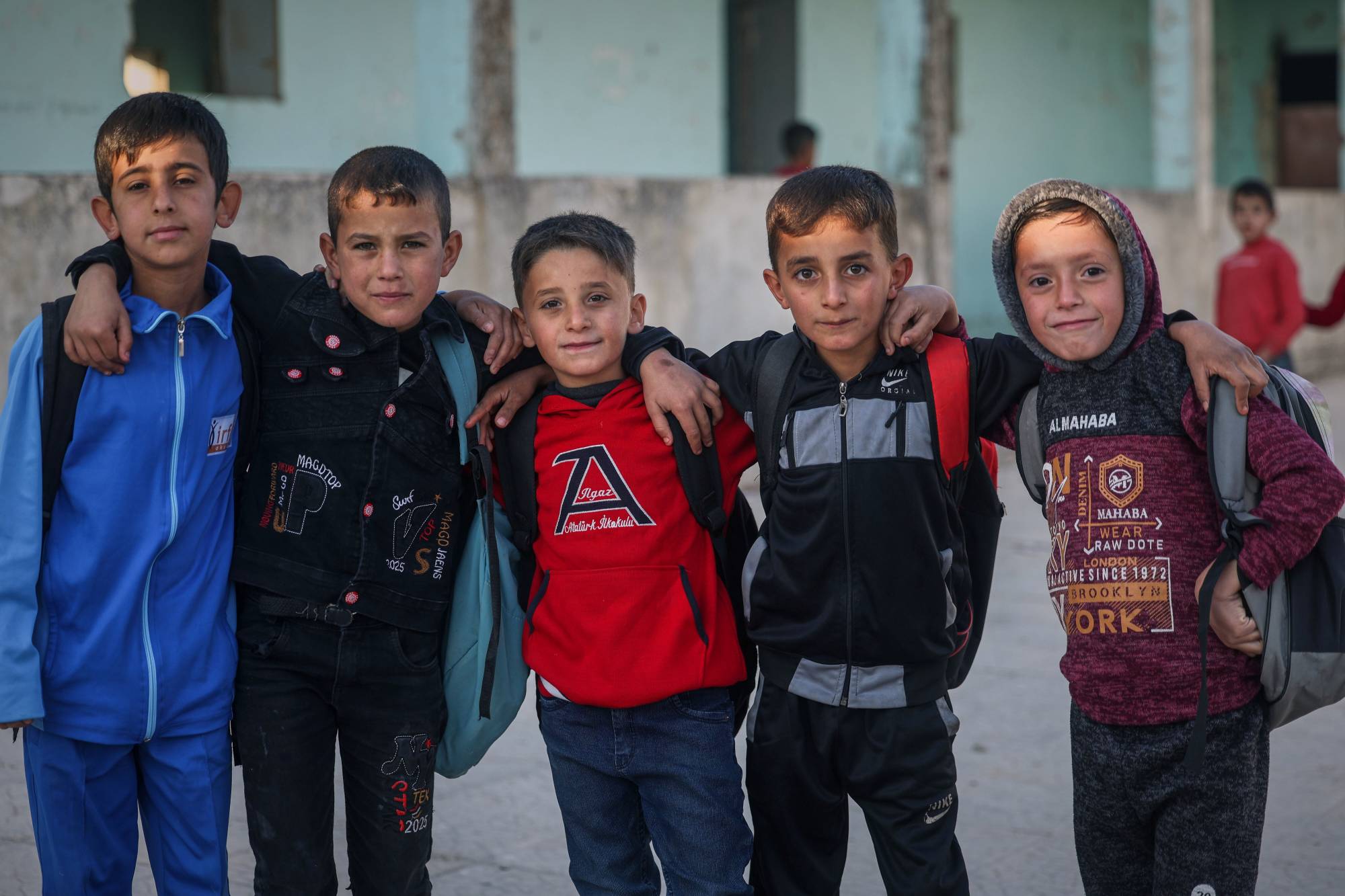 في الداخل، تتسرّب أشعة الشمس من إطارات النوافذ الخالية من الزجاج. يجلس التلاميذ على بطانيات رقيقة مفروشة على الأرض الباردة، مسنِدين ظهورهم إلى الجدران. توازن طفلة صغيرة دفترها على ركبتيها وهي تتدرّب على كتابة الحروف العربية.