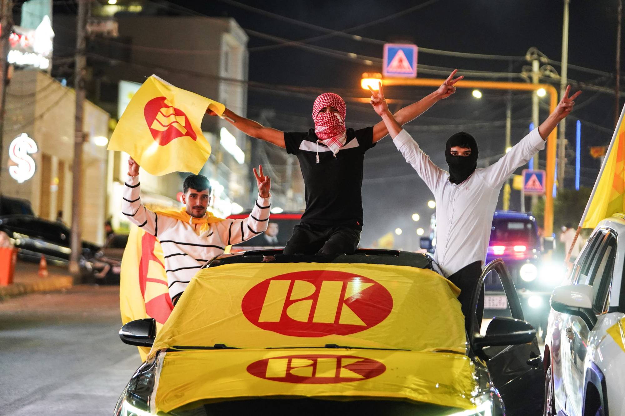 أنصار الحزب الديمقراطي الكردستاني يحتفلون في شوارع دهوك شمال العراق عقب إعلان النتائج الأولية للانتخابات (د.ب.أ)