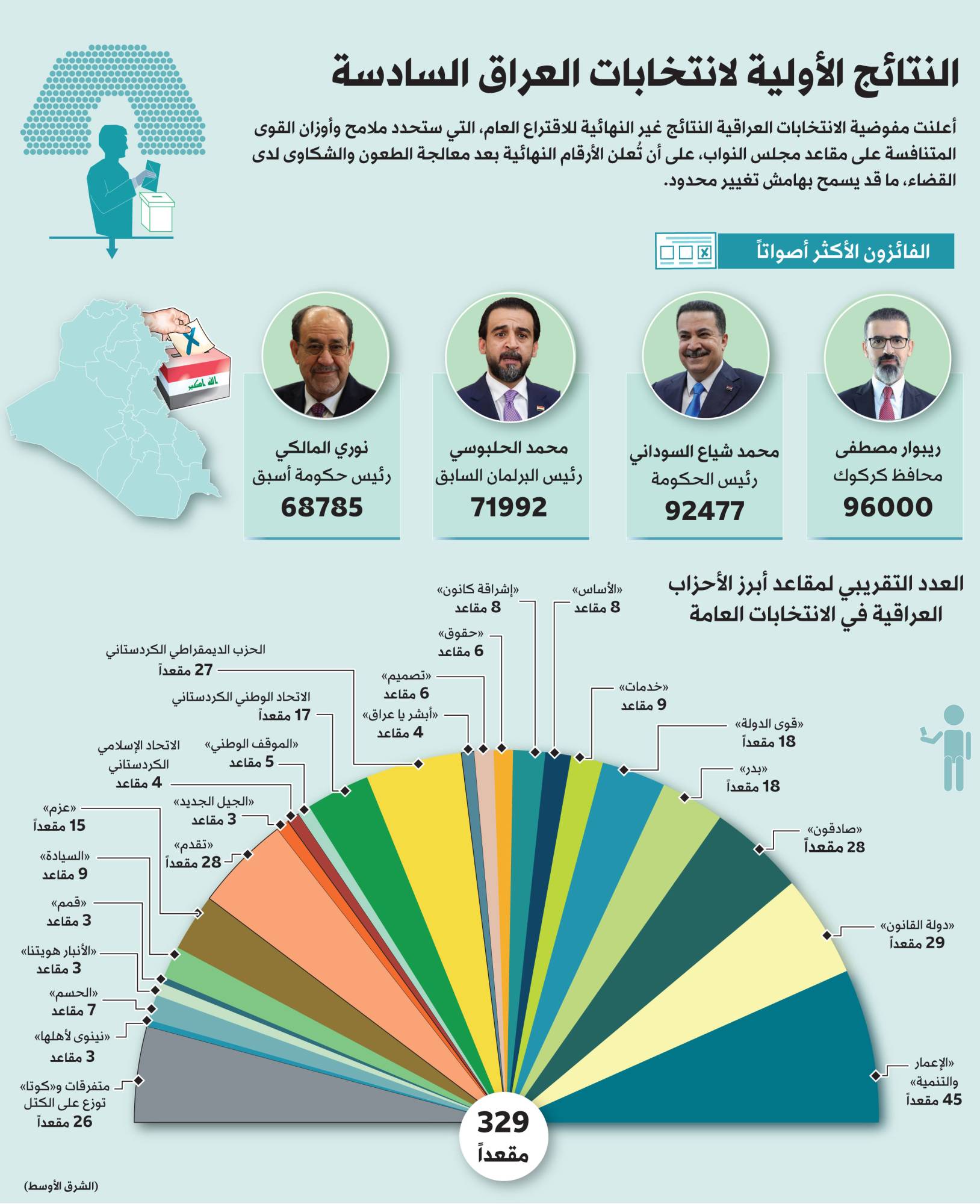أظهرت النتائج غير النهائية للانتخابات البرلمانية في العراق أن ائتلاف «الإعمار والتنمية» بزعامة رئيس الوزراء الحالي محمد شياع السوداني، تصدر السباق، لكنه فوز قد يتحول إلى خسارة مع مواجهة معركة سياسية معقدة لتجديد ولايته، وسط تحركات داخل تحالف «الإطار التنسيقي» لتشكيل «الكتلة الأكبر»، وتباين المواقف حول شكل الحكومة المقبلة وهوية رئيسها.