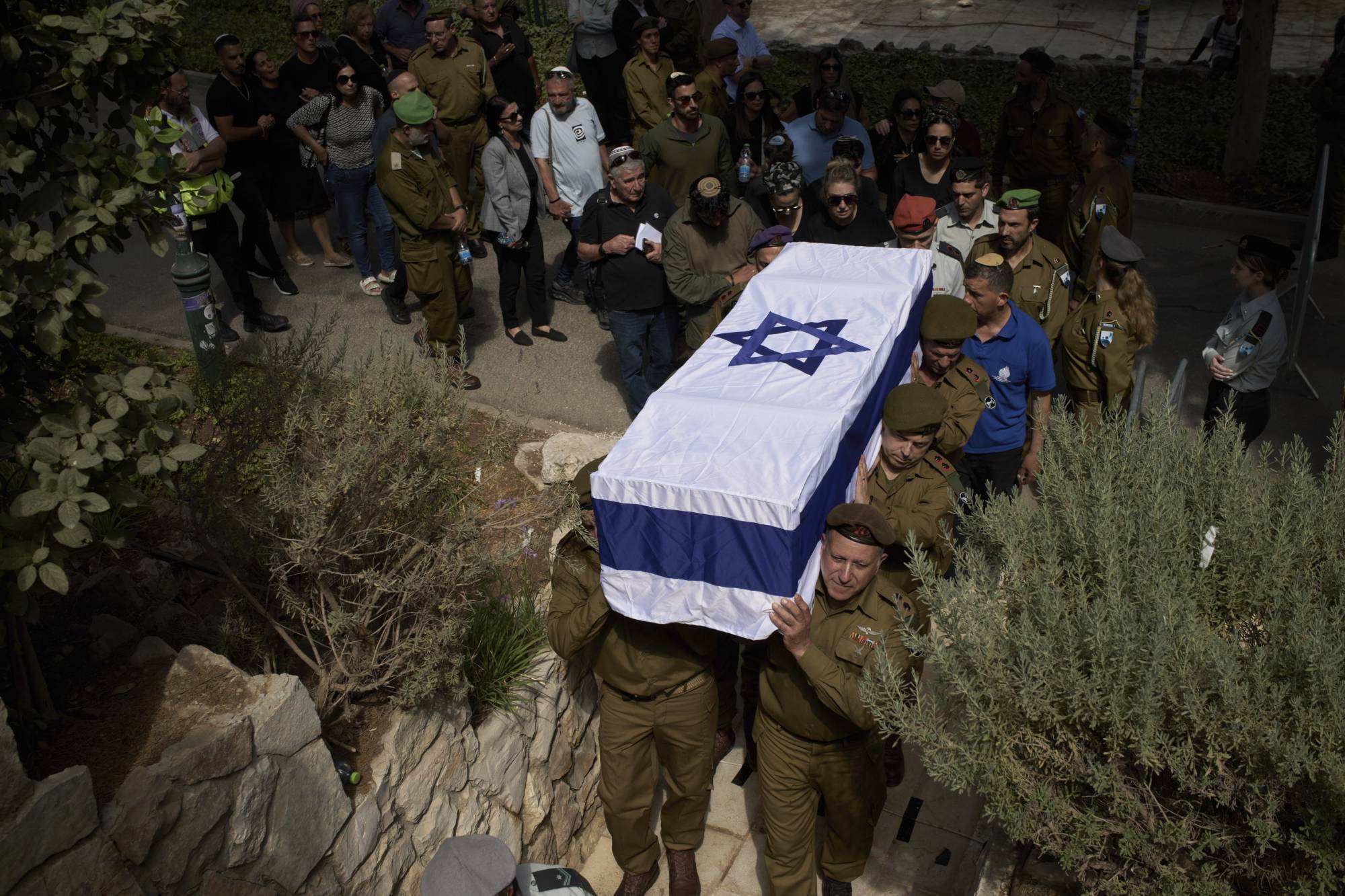 جنود إسرائيليون يحملون نعش إسحاق هريش الذي قُتل في هجوم إطلاق نار الخميس على معبر جسر «الملك حسين» بين الضفة الغربية والأردن (أ.ب)