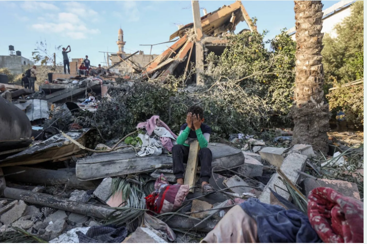 طفل يجلس وسط أنقاض منزل دمَّره القصف الإسرائيلي في النصيرات وسط قطاع غزة (أ.ف.ب)
