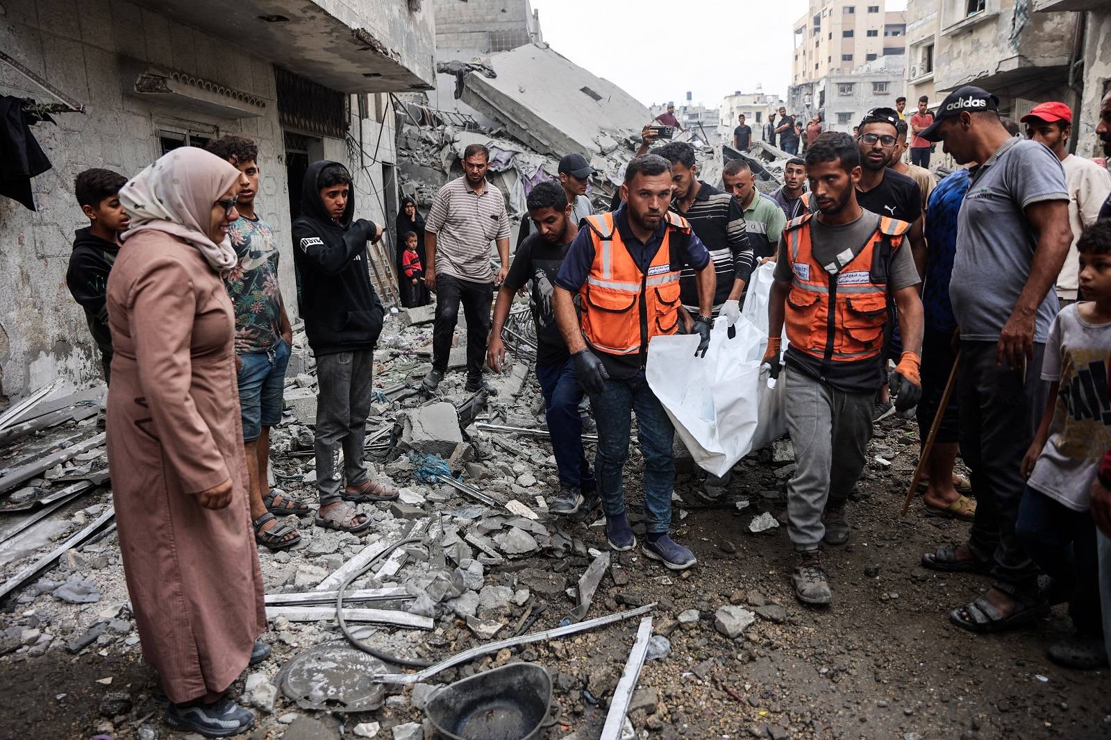 فلسطينيون يحملون جثثاً انتشلوها من بين أنقاض منزل دُمّر في غارة إسرائيلية بمدينة غزة (أ.ف.ب)