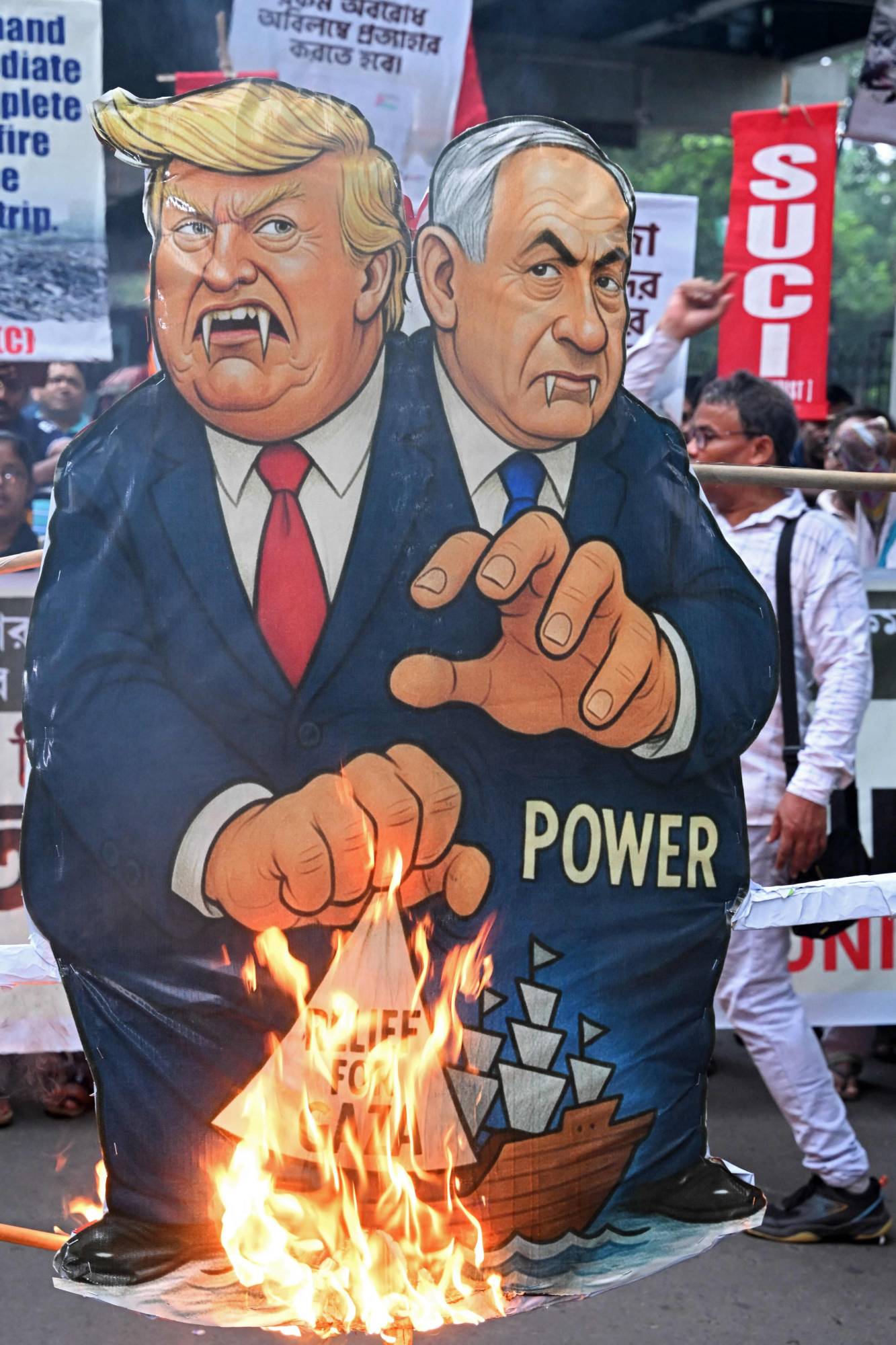 متظاهرون في الهند يحرقون دميةً للرئيس الأميركي دونالد ترمب ورئيس الوزراء الإسرائيلي بنيامين نتنياهو خلال احتجاجٍ مناهضٍ لإسرائيل في ذكرى 7 أكتوبر يوم الثلاثاء (أ.ف.ب)