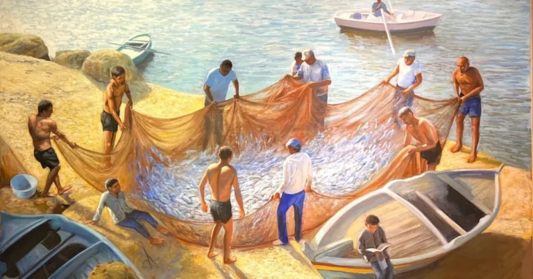 وعن لوحة الصيادين الذين ينتظرون رزقهم، حيث تتجمّع الأسماك الذهبية في مركز الشِباك، يقول الفنان: “إن شرارة تلك اللوحة بدأت قبل عقود خلال زياراتي المتكررة إلى الإسكندرية، حيث التقيت الصيادين مراراً، وأذكر أحدهم كان يدعى “حمدان الأصيل “رسمته في عدد من لوحاتي”.