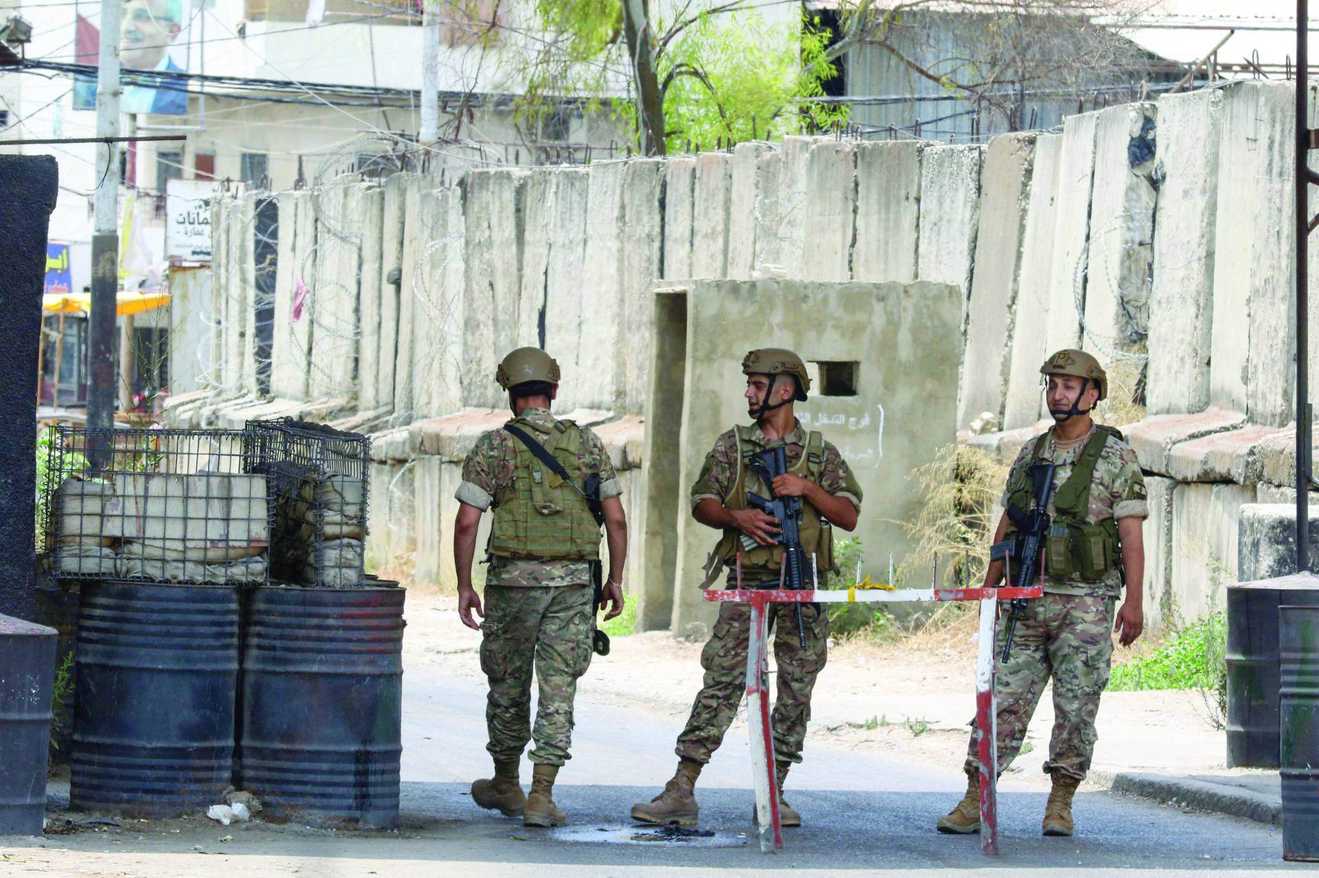 جنود لبنانيون عند مدخل مخيم عين الحلوة في جنوب البلاد (أرشيفية – أ.ف.ب)