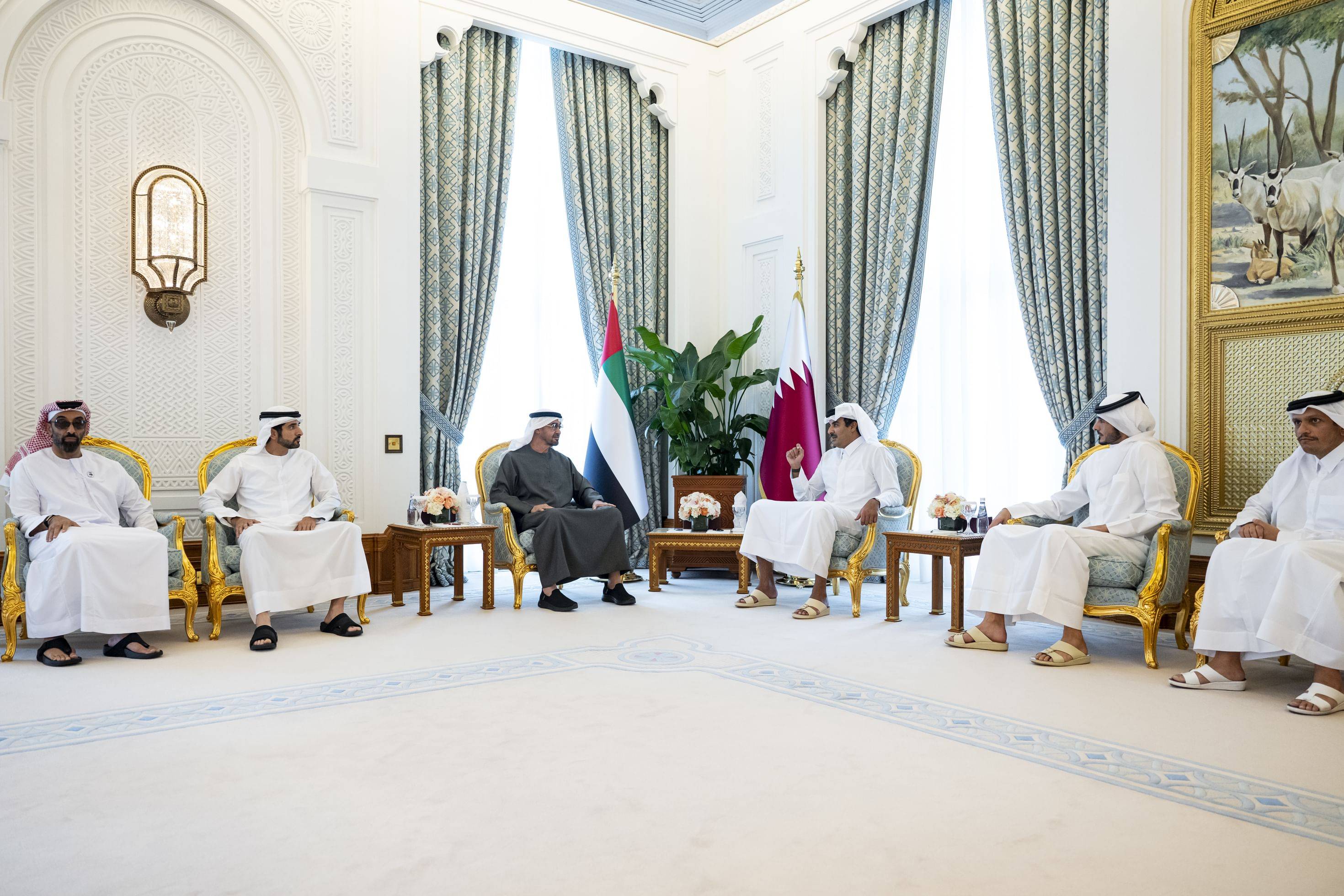 بحث الشيخ محمد بن زايد آل نهيان، رئيس دولة الإمارات، مع الشيخ تميم بن حمد آل ثاني، أمير دولة قطر، العلاقات الثنائية بين البلدين وسبل تعزيزها، إضافة إلى تطورات الاعتداء الإسرائيلي على الأراضي القطرية. وجدد الشيخ محمد بن زايد خلال اللقاء الذي عقد في الديوان الأميري بالعاصمة القطرية الدوحة ضمن زيارة أخوية، تضامن الإمارات الكامل مع قطر ودعمها جميع الإجراءات التي تتخذها للحفاظ على سيادتها وسلامة أراضيها وشعبها.