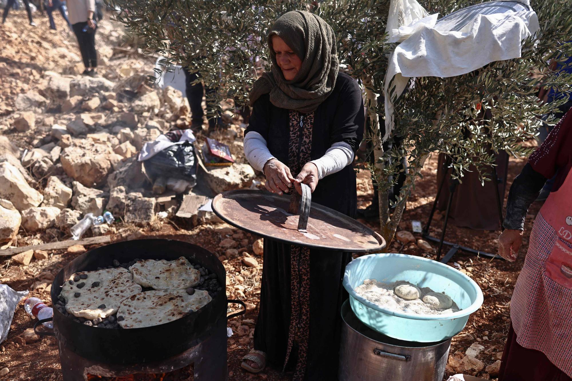فلسطينية تعد الخبز لمتطوعين يساعدون في حصاد الزيتون ببلدة بيرزيت شمال رام الله بالضفة الغربية الخميس (أ.ف.ب)