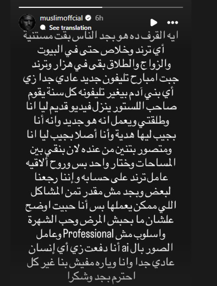 وكتب مسلم عبر خاصية القصص المصوّرة الملحقة بحسابه الخاص في “إنستغرام”، قائلاً: “إيه القرف ده هو بجد الناس بقت مستنية أي ترند وخلاص حتى في البيوت والزواج والطلاق بقى في هزار وترند جبت إمبارح تليفون جديد عادي جداً زي أي بني آدم بيغير تليفونه كل سنة يقوم صاحب الاستور ينزّل فيديو قديم ليا أنا وطليقتي ويعمل إنه هو جديد وإنه أنا بجيب ليها هدية وأنا أصلاً بجيب ليا”.