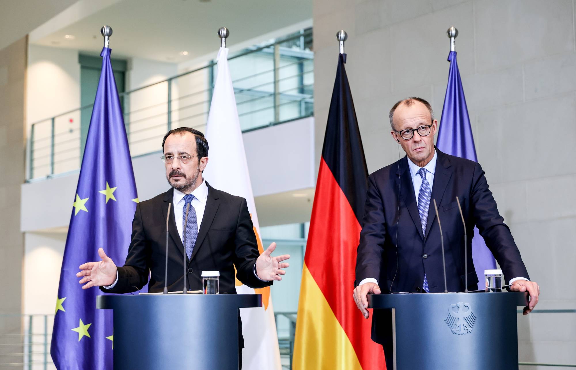 ميرتس وخريستودوليدس خلال مؤتمر صحافي ببرلين في 14 نوفمبر (إ.ب.أ)