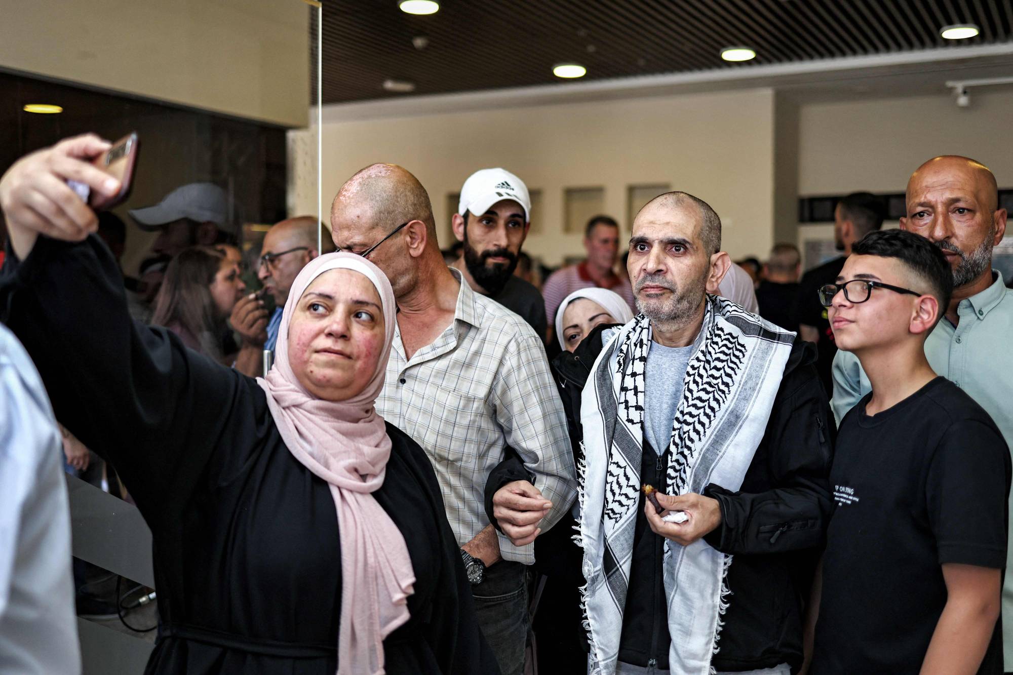 أحد الأسرى الفلسطينيين الذي أُطلق سراحه في صفقة التبادل بين إسرائيل و«حماس» يقف لالتقاط صورة عند وصوله بالحافلة إلى مركز رام الله الثقافي بالضفة الغربية 13 أكتوبر 2025 (أ.ف.ب)