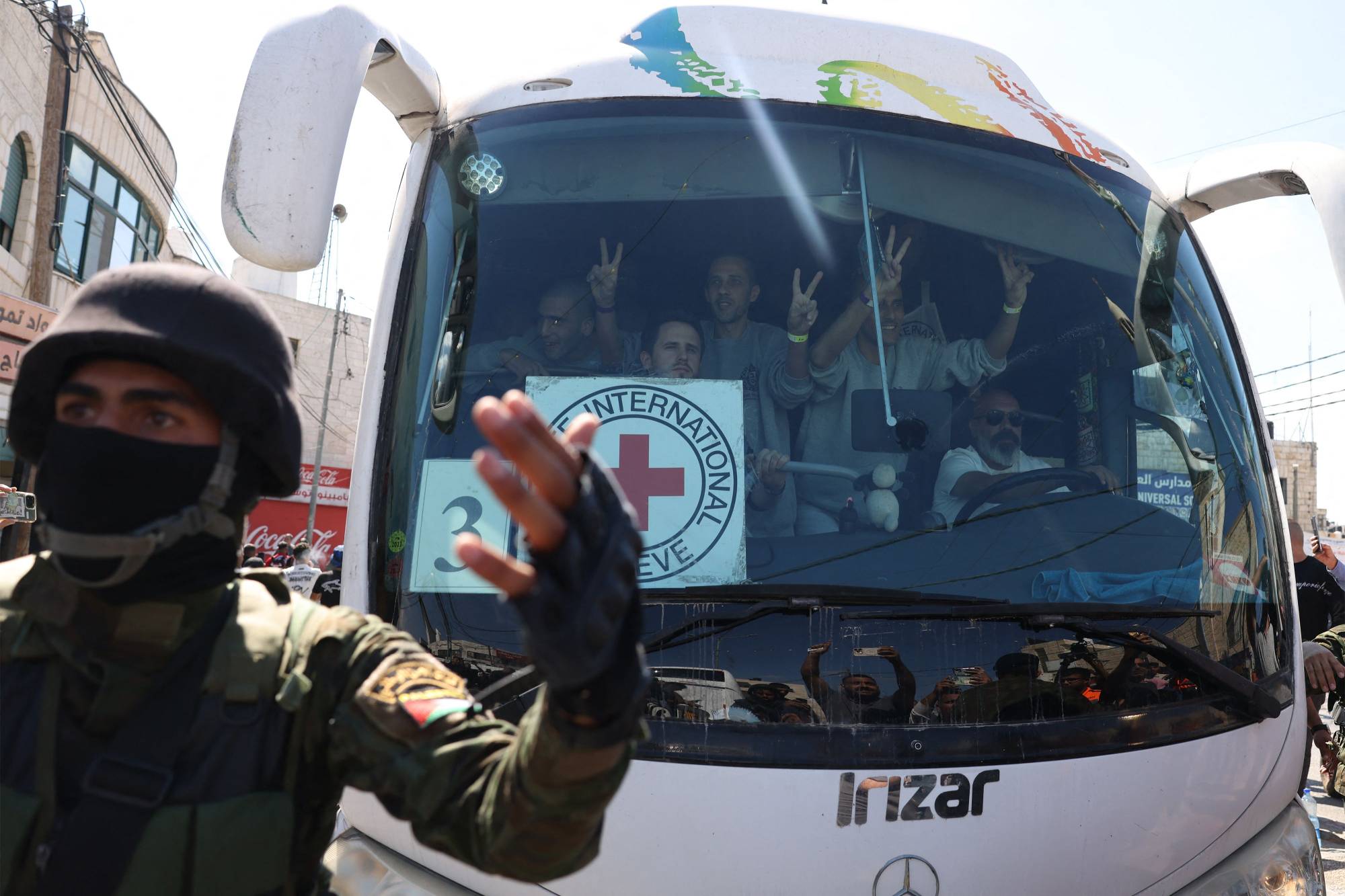 أحد أفراد قوات الأمن الفلسطينية يفسح الطريق أمام حافلة تُقل فلسطينيين محرَّرين بالضفة الغربية 13 أكتوبر 2025 (أ.ف.ب)