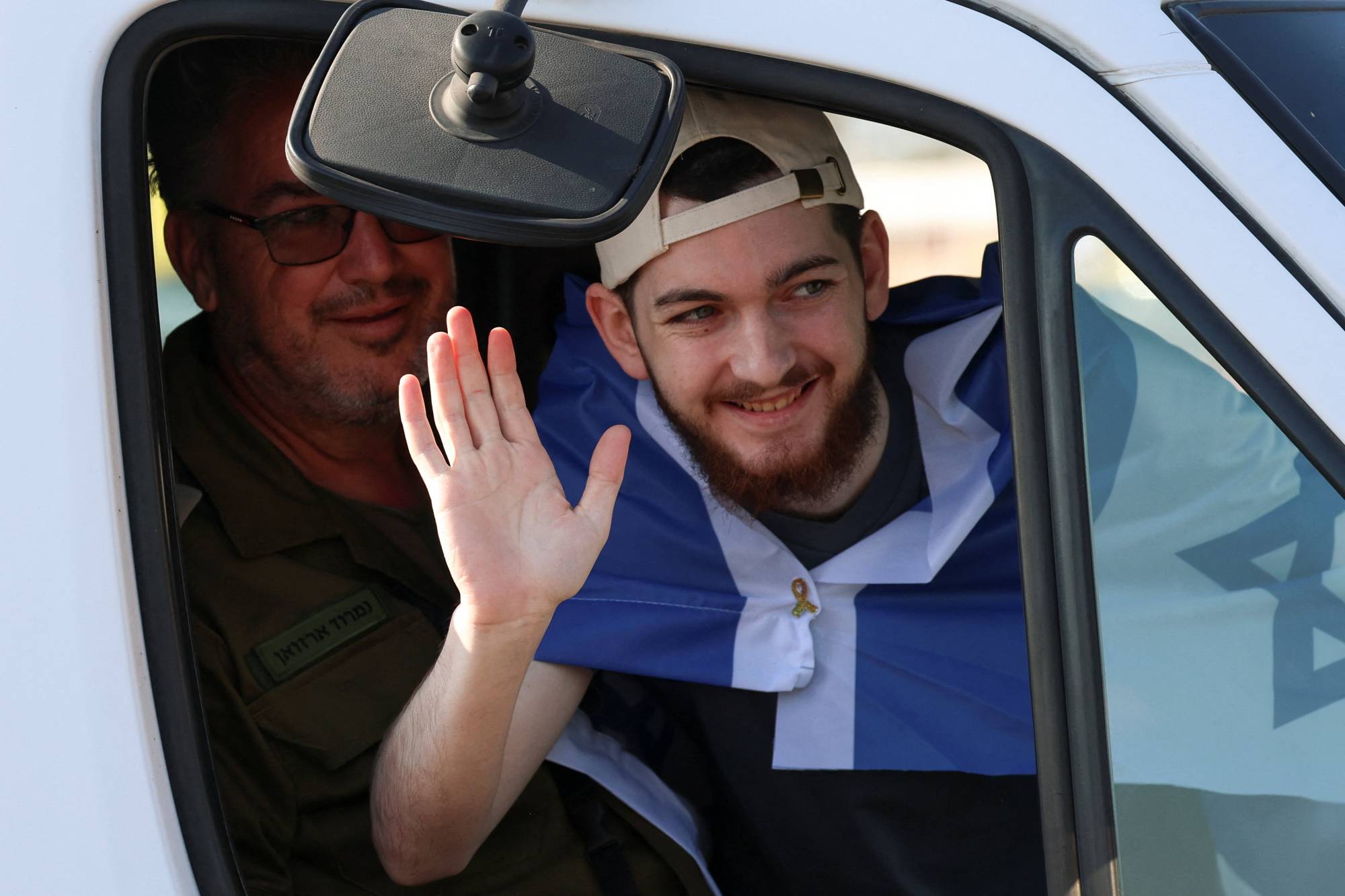 الرهينة الإسرائيلي المفرج عنه ألون أوهل يُحيي المهنئين لدى وصوله إلى مستشفى بيلينسون في مركز رابين الطبي في بتاح تكفا وسط إسرائيل 13 أكتوبر 2025 (أ.ف.ب)