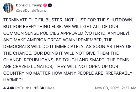في انتظار نتائج انتخابات الثلاثاء وانعكاساتها، يلعب الرئيس الأميركي، دونالد ترمب، دوراً بارزاً في دفع الجمهوريين نحو الالتزام بموقفهم الرافض التسوية… فبدلاً من الدعوة إلى التفاوض، أعاد ترمب طرح فكرة «الخيار النووي» الذي دعا إليه بعد عودته من جولته الآسيوية. ولا يرتبط هذا الخيار بترسانة الأسلحة النووية الأميركية، بل هو تعبير أُطلق لتوصيف تكتيك تشريعي خطير يُلغي ما تُسمّى «قاعدة الـ60» في مجلس الشيوخ.