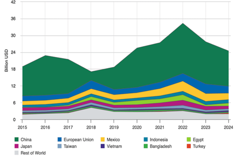 لسنوات عديدة، ظلت الصين أكبر عميل لنا في الخارج لمزارعي فول الصويا ـ بفارق كبير. وفي عام 2024، استحوذت الصين على أكثر من نصف صادرات فول الصويا الأمريكية. أما ثاني أكبر عميل، وهو الاتحاد الأوروبي، فلم يمثل سوى العُشر. وفي الأعوام التي شهدت صعوداً وهبوطاً بالنسبة للصادرات الأميركية، كان تقدم الصين كبيراً.