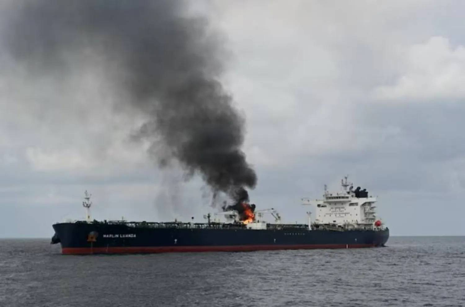 تصاعد الدخان من سفينة «مارلين لواندا» بعد إصابتها بصاروخ أطلقه الحوثيون في خليج عدن العام الماضي (أرشيفية – رويترز)