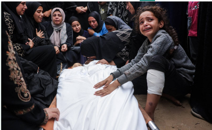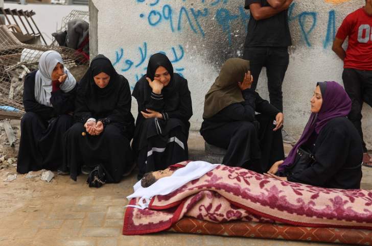 رد فعل فلسطينيين على مقتل طفلَين بغارة إسرائيلية في مستشفى ناصر بخان يونس (أ.ف.ب)