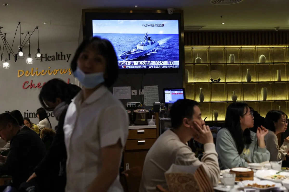 شخص يشاهد أخباراً عن إجراء الجيش الصيني تدريبات بالذخيرة الحية حول تايوان داخل متجر إفطار في تايبيه (إ.ب.أ)