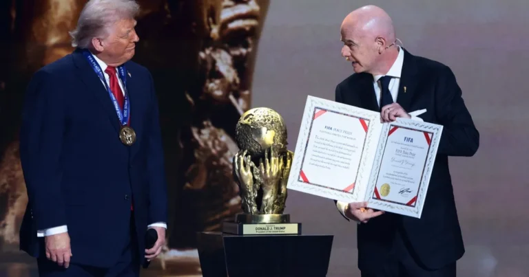 تسلم الرئيس الأميركي دونالد ترمب جائزة فيفا للسلام، الجمعة، والتي قدمها له رئيس الاتحاد الدولي لكرة القدم (فيفا) جياني إنفانتينو، وذلك خلال حفل قرعة كأس العالم المقررة في 2026.