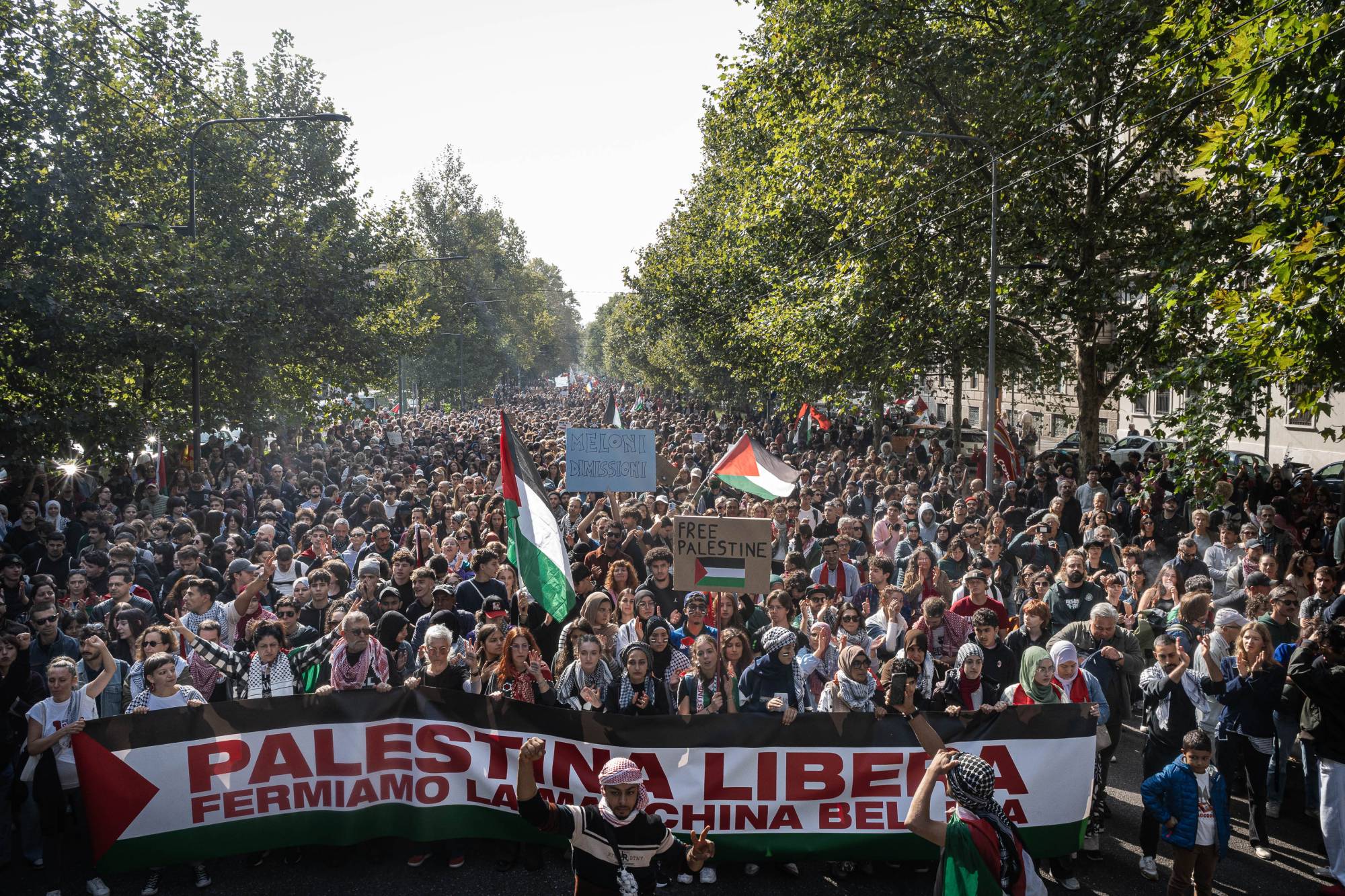 وتظاهر أكثر من 80 ألف شخص في ميلانو، وفق ما أفادت الشرطة «وكالة الصحافة الفرنسية». وسارت حشود ضخمة رفعت الأعلام الفلسطينية، وهتفت خلف لافتة كبيرة كتب عليها «حرروا فلسطين، أوقفوا آلة الحرب».