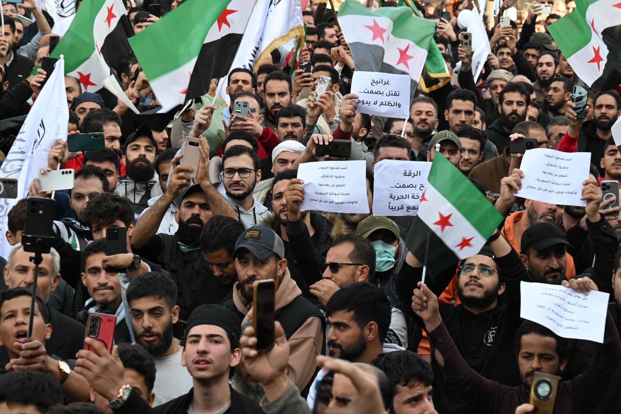 في دمشق، كما في مدن أخرى بينها حلب (شمال) وإدلب (شمال غربي) وحمص وحماة (وسط) وطرطوس واللاذقية (غرب)، خرجت مظاهرات حاشدة رفعت الأعلام السورية، وردّد المشاركون فيها هتافات مؤيدة للشرع.