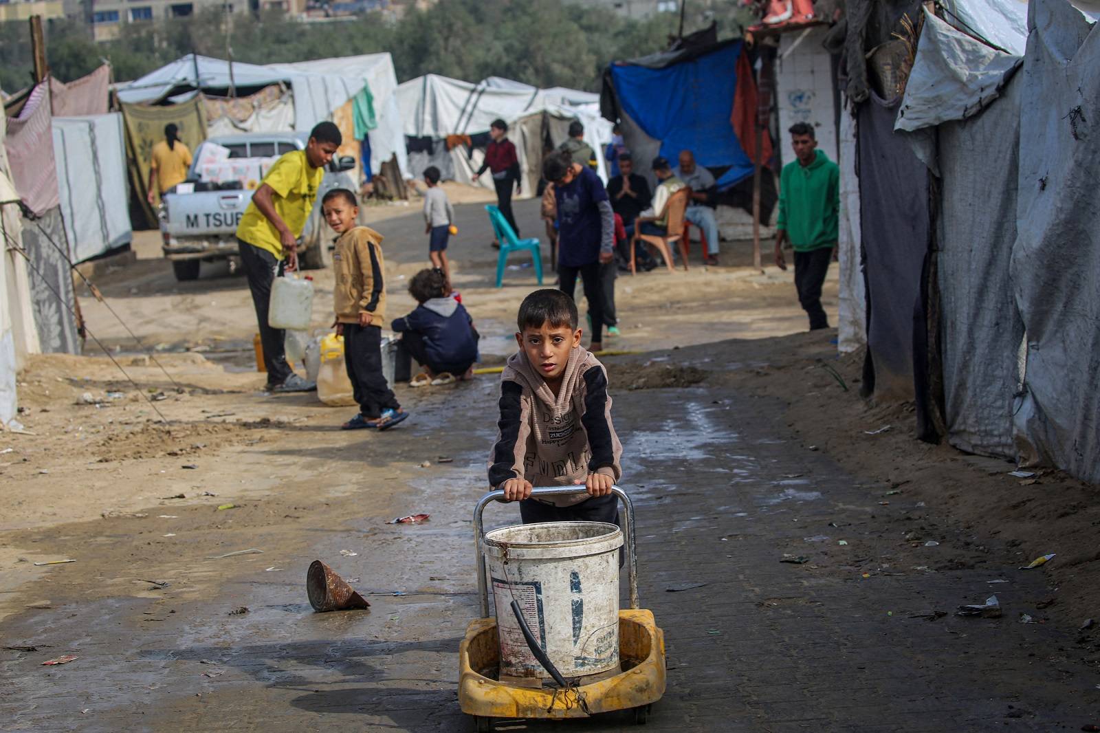 طفل يدفع دلواً بينما يملأ آخرون حاوياتهم بالمياه في مخيم النصيرات للنازحين الفلسطينيين وسط قطاع غزة (أ.ف.ب)