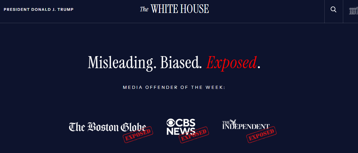 أطلق البيت الأبيض قسماً جديداً على موقعه الرسمي يوم الجمعة، ينتقد علناً المنظمات الإعلامية والصحافيين الذين يدَّعي أنهم «يشوهون التغطية الإعلامية بسبب قصصهم المتحيزة».