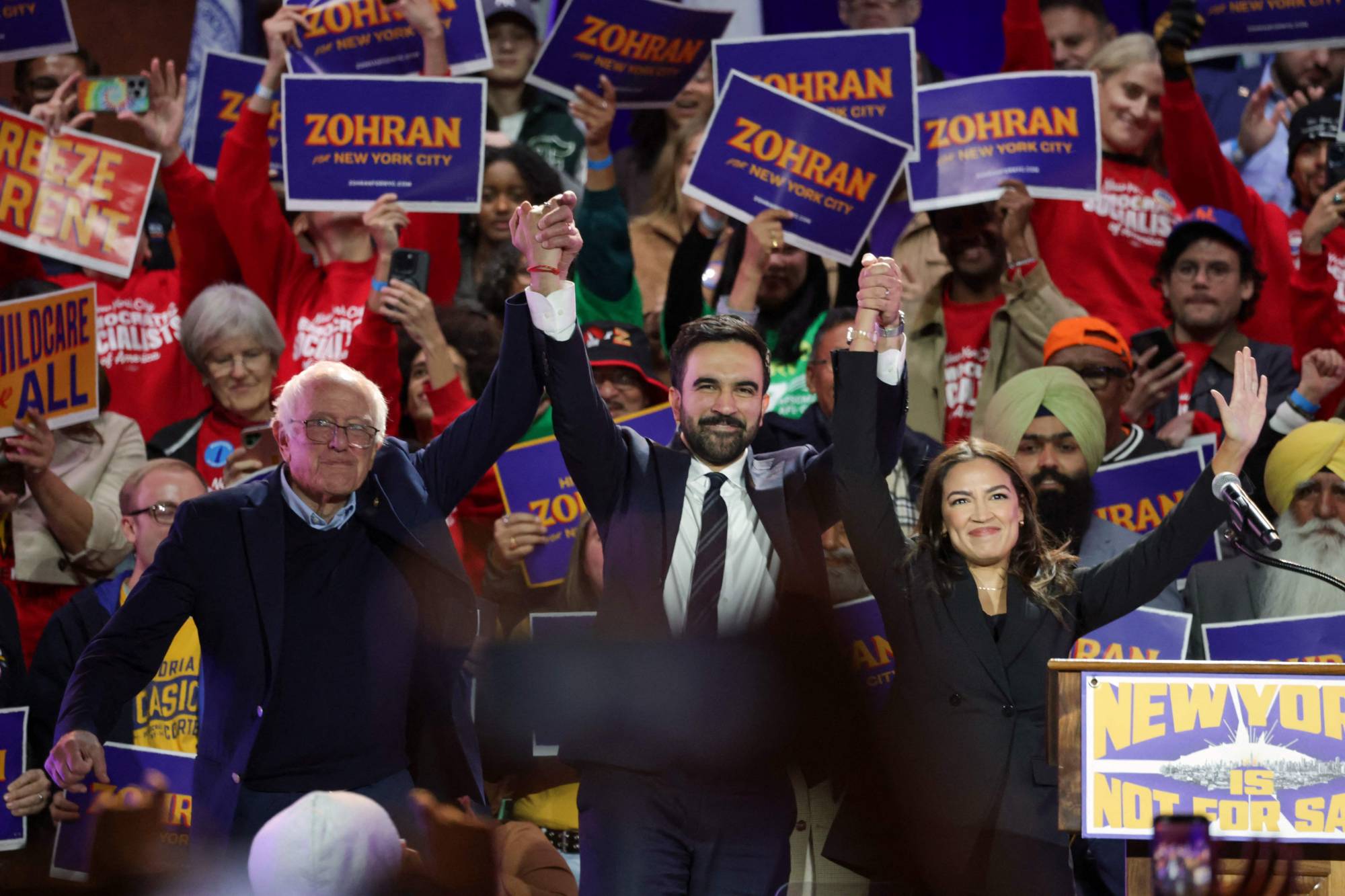 ممداني مع السيناتور التقديمي برني ساندرز والنائبة التقدمية ألكسندريا وكاسيو كورتيز في 4 نوفمبر 2025 (أ.ف.ب)